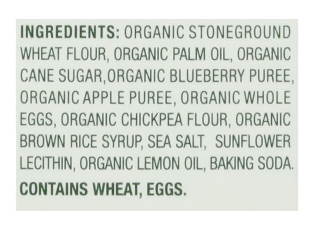 Ingredients: Organic Stoneground Wheat Flour, Organic Palm Oil, Organic Cane Sugar, Organic Blueberry Puree, Organic Apple Puree, Organic Whole Eggs, Organic Chickpea Flour, Organic Brown Rice Syrup, Sea Salt, Sunflower Lecithin, Organic Lemon Oil, Baking Soda Contains: Wheat, Eggs