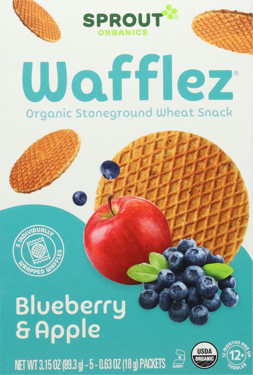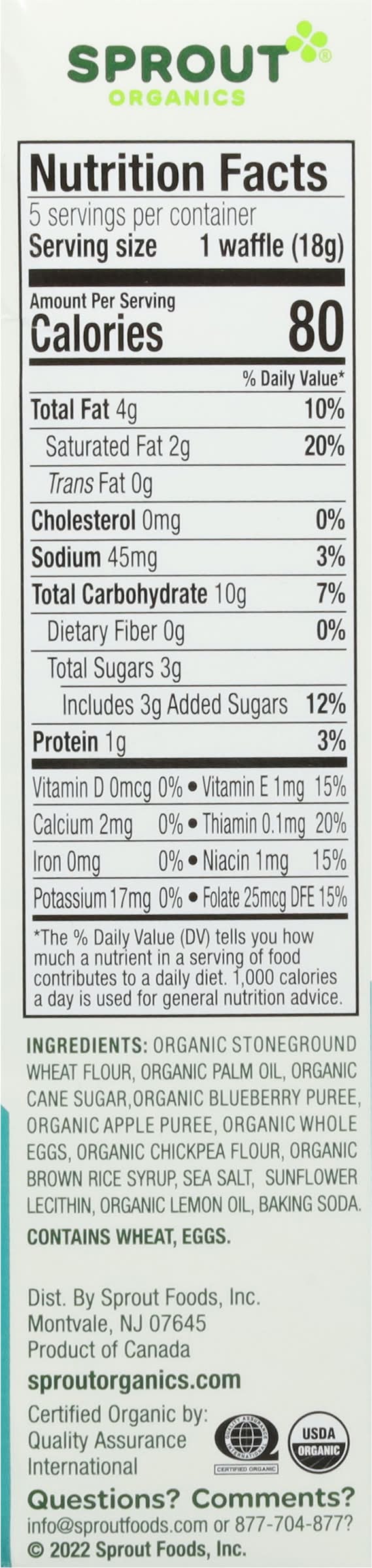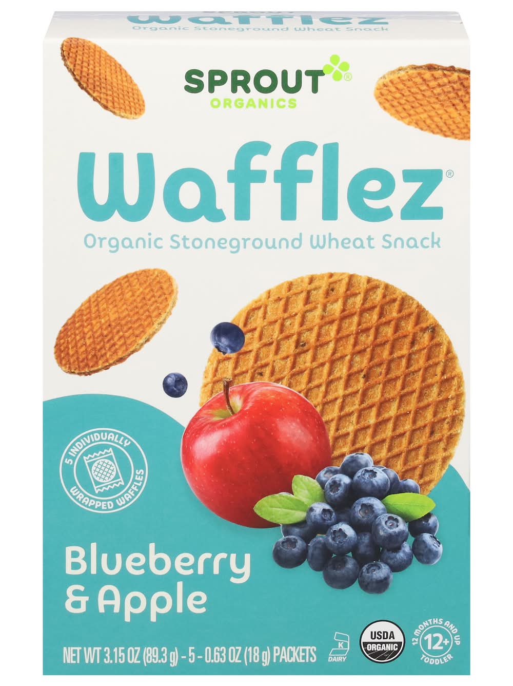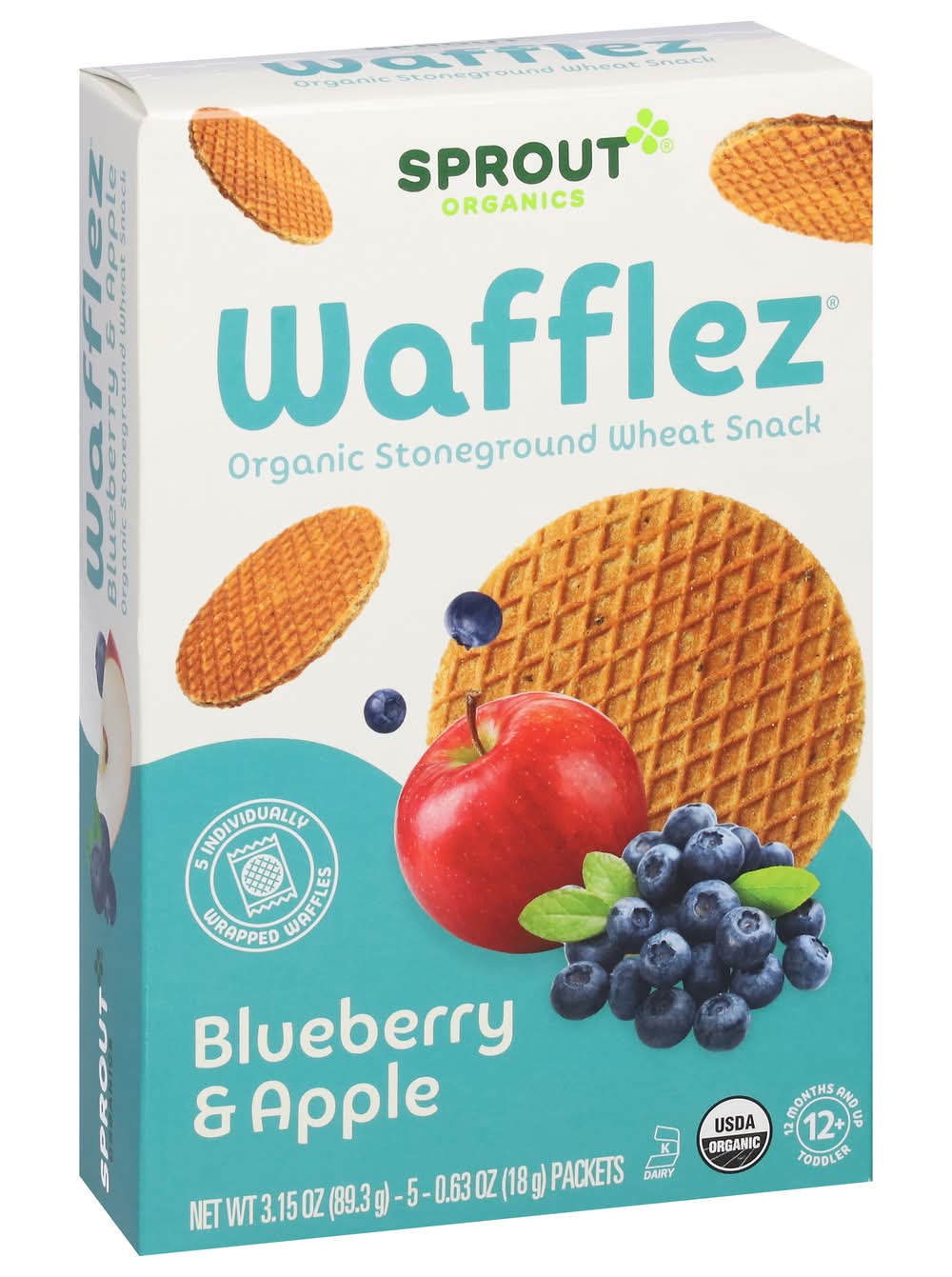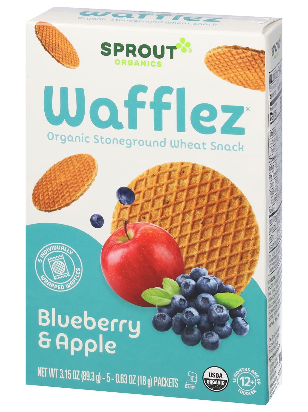 Oven baked stoneground wheat snack. USDA Certified. Certified Organic by: Quality Assurance International. No added colors or flavors. Made with real organic whole eggs. USDA Certified Organic. Non GMO. Nothing artificial. Made with real fruit, nothing artificial. Made with 100% stoneground European wheat, real fruit. New! 5 individually wrapped waffles.The perfect oven baked snack for hungry toddlers. Sprout has re-imagined the popular Belgian treat to create the perfect toddlers snack. Each Sprout Foods, Inc., Montvale, NJ, 07645