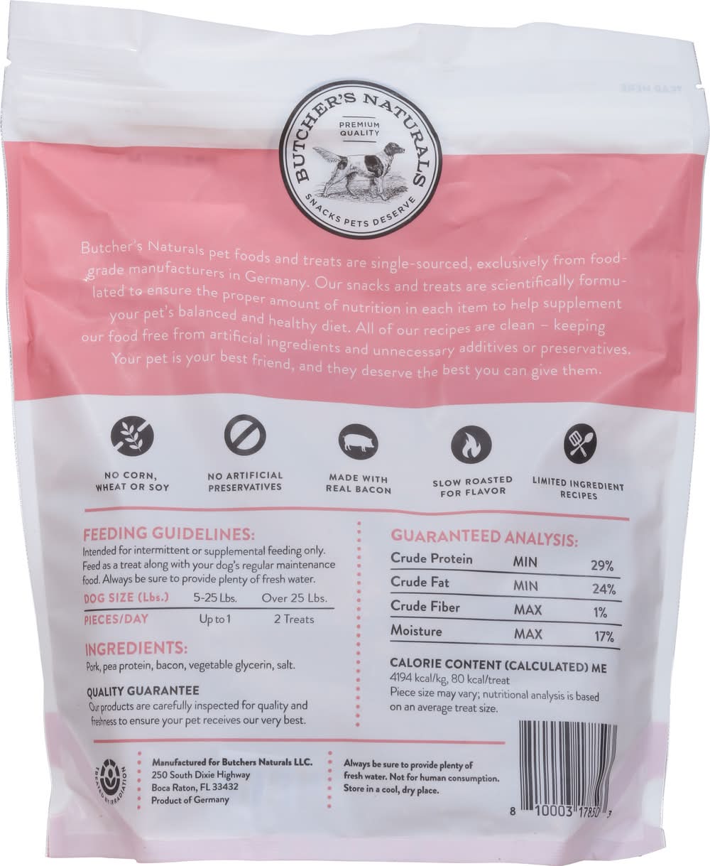 These are crafted for quality and freshness, ensuring a premium snack for pets. Made in Germany, these treats are slow-roasted to enhance flavor and contain 75% meat with no corn, wheat, or soy. Formulated to complement a balanced and healthy diet, they do not include artificial preservatives and are free from artificial ingredients and unnecessary additives. The production process involves a single source from food-grade manufacturers, with a focus on small batch creation. These treats are also treated by irradiation for safety. Butchers Naturals LLC., 250 South Dixie Highway Boca Raton, FL 33432