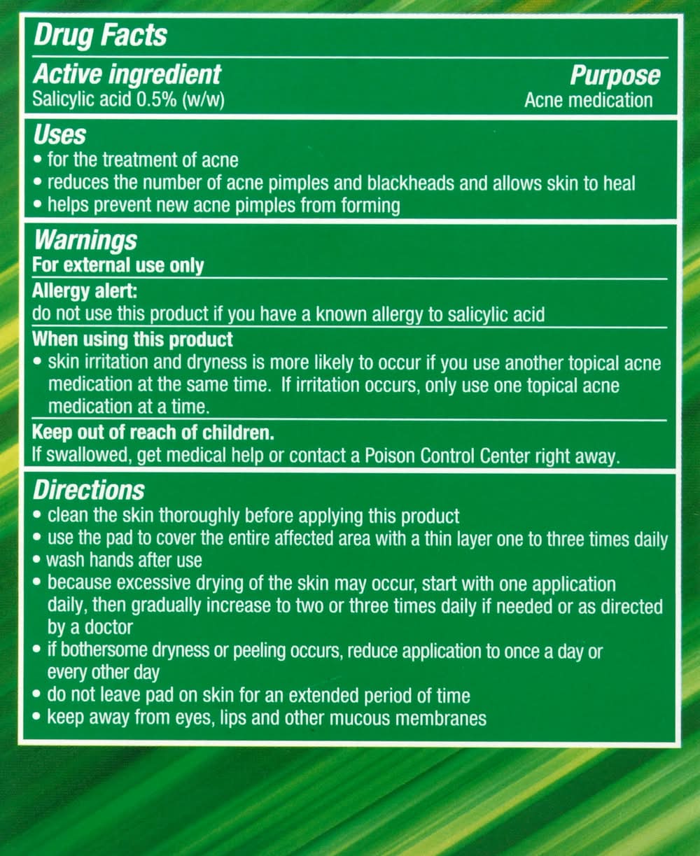 Directions: clean the skin thoroughly before applying this product. use the pad to cover the entire affected area with a thin layer one to three times daily. wash hands after use. because excessive drying of the skin may occur, start with one application daily, then gradually increase to two or three times daily if needed or as directed by a doctor. if bothersome dryness or peeling occurs, reduce application to once a day or every other day. do not leave pad on skin for an extended period of time. keep away from eyes, lips and other mucous membranes.