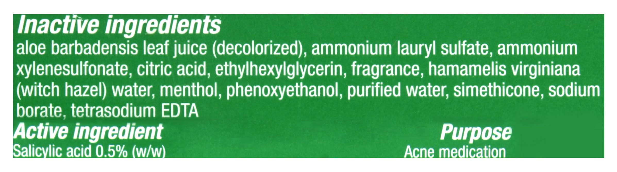 Ingredients: Active Ingredients: Salicylic Acid (0.5 % (w/w)), Acne Medication. Inactive Ingredients: Aloe Barbadensis Leaf Juice (Decolorized), Ammonium Lauryl Sulfate, Ammonium Xylenesulfonate, Citric Acid, Ethylhexyglycerin, Fragrance, Hamamelis Virginiana (Witch Hazel) Water, Menthol, Phenoxyethanol, Purifed Water, Simethicone, Sodium Borate, Tetrasodium EDTA