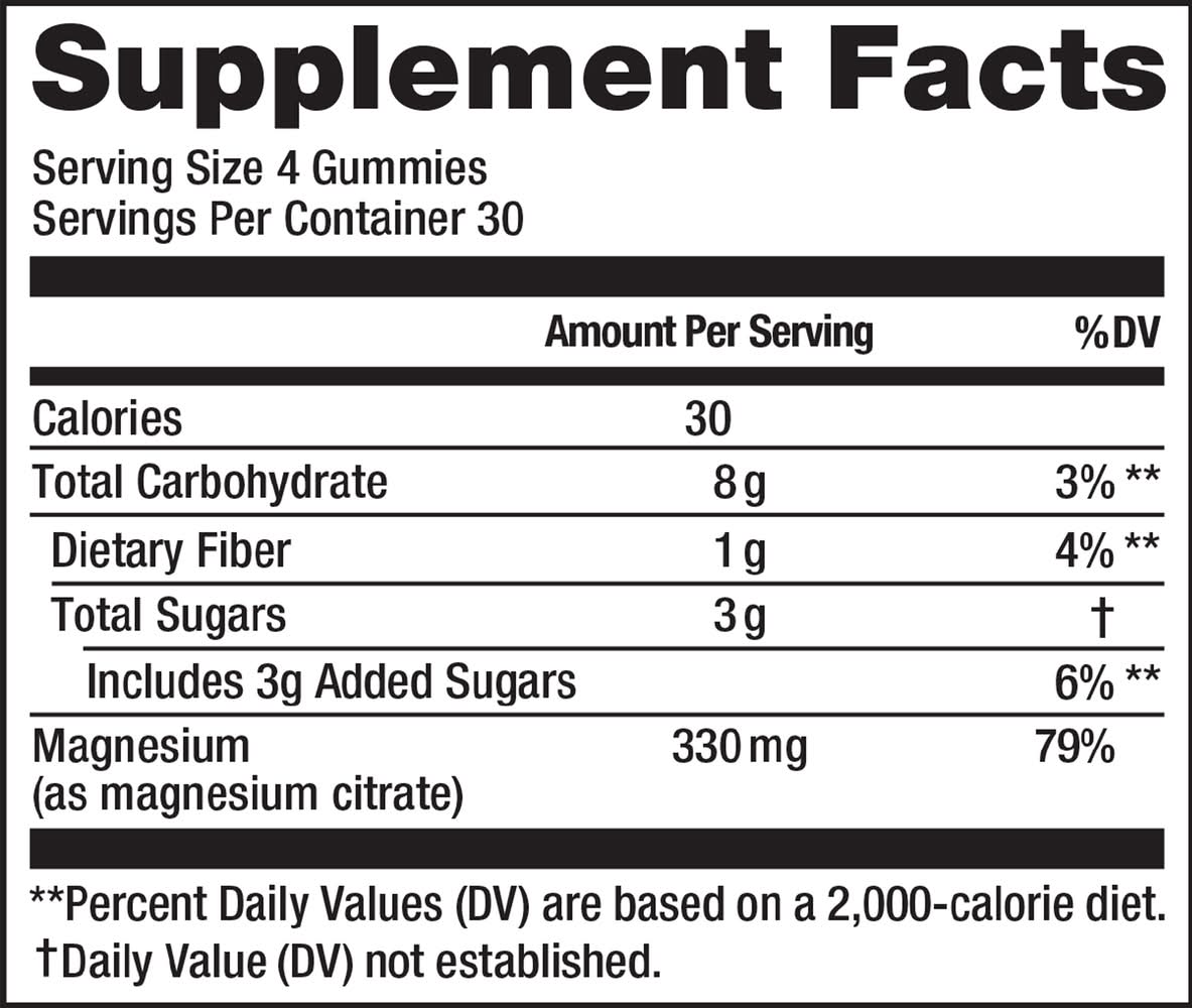 Ingredients: Magnesium (as magnesium citrate). Other ingredients: Organic tapioca syrup, organic cane sugar, water, inulin, Contains 2% or less of: glycerin, agar, natural flavors, locust bean gum, citric acid, organic black carrot (color).