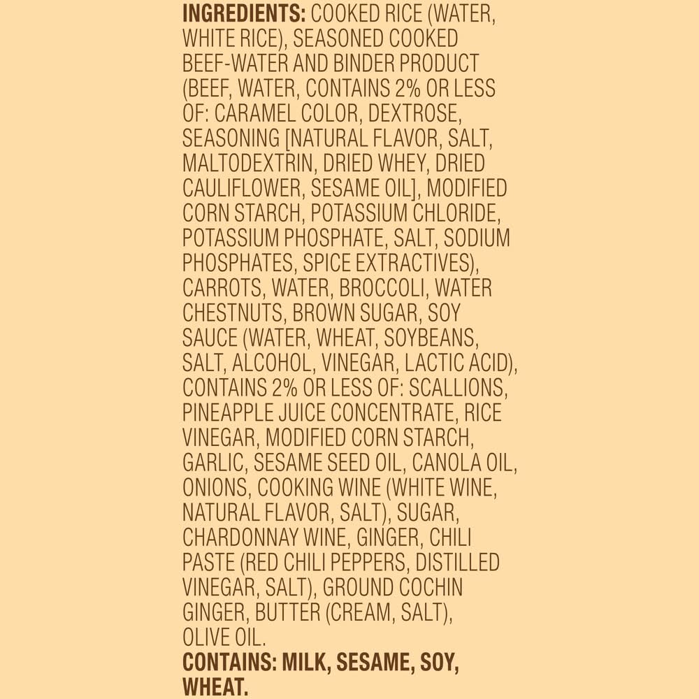 Ingredients: Cooked Rice (Water White Rice), Seasoned Cooked Beef and Binder Product (Beef Water Contains 2% or Less of: Caramel Color Dextrose Seasoning [Natural Flavor Salt Maltodextrin Dried Whey Dried Cauliflower Sesame Oil] Modified Corn Starch Potassium Chloride Potassium Phosphate Salt Sodium Phosphates Spice Extractives), Carrots, Water, Broccoli, Water Chestnuts, Brown Sugar, Soy Sauce (Water Wheat Soybeans Salt Alcohol Vinegar Lactic Acid), Contains 2% or Less of: Scallions, Pineapple Juice Concentrate, Rice Vinegar, Modified Corn Starch, Garlic, Sesame Seed Oil, Canola Oil, Onions, Cooking Wine (White Wine Natural Flavor Salt), Sugar, Chardonnay Wine, Ginger, Chili Paste (Red Chili Peppers Distilled Vinegar Salt), Ground Cochin Ginger, Butter (Cream Salt), Olive Oil Contains: Dairy, Gluten, Lactose, Milk, Sesame, Soy, Wheat