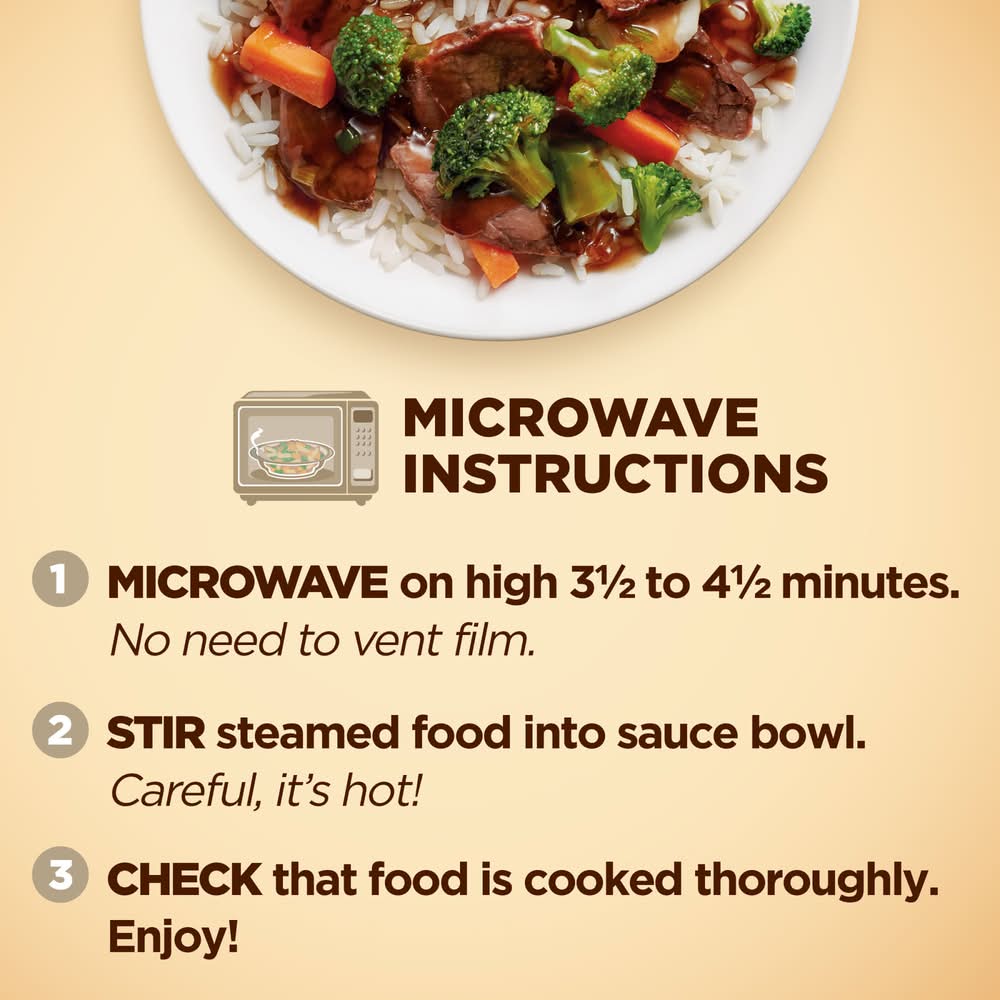 Directions for use: Must be cooked thoroughly. Microwave: 1. Microwave on high 3-1/2 to 4-1/2 minutes. No need to vent film. 2. Stir steamed food into sauce bowl. Careful, it's hot! 3. Check that food is cooked thoroughly. Enjoy! Do not use if film is broken. Cook only one at a time. Do not cook in conventional or toaster ovens. For Food Safety and Quality: Keep frozen. Do not thaw. Microwave directions developed with 1100-watt microwave ovens. Appliances vary. Adjust cooking times as needed. Food must be cooked thoroughly to 165 degrees F. Read and follow these cooking directions. Storage recommendation: Keep frozen.