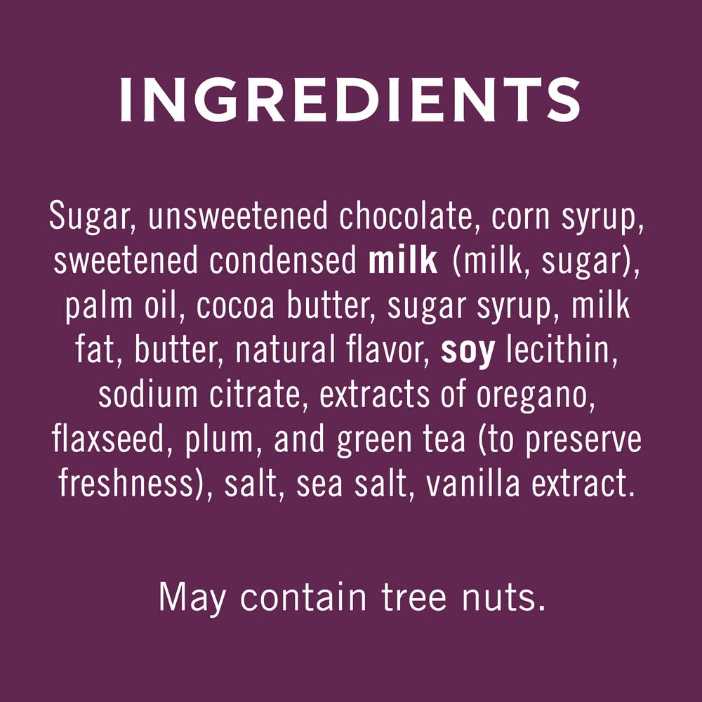 Ingredients: Ingredients: Sugar, unsweetened chocolate, corn syrup, sweetened condensed milk (milk, sugar), palm oil, cocoa butter, sugar syrup, milk fat, butter, natural flavor, soy lecithin, sodium citrate, extracts of oregano, flaxseed, plum, and green tea (to preserve freshness), salt, sea salt, vanilla extract. Contains: Milk, Soy