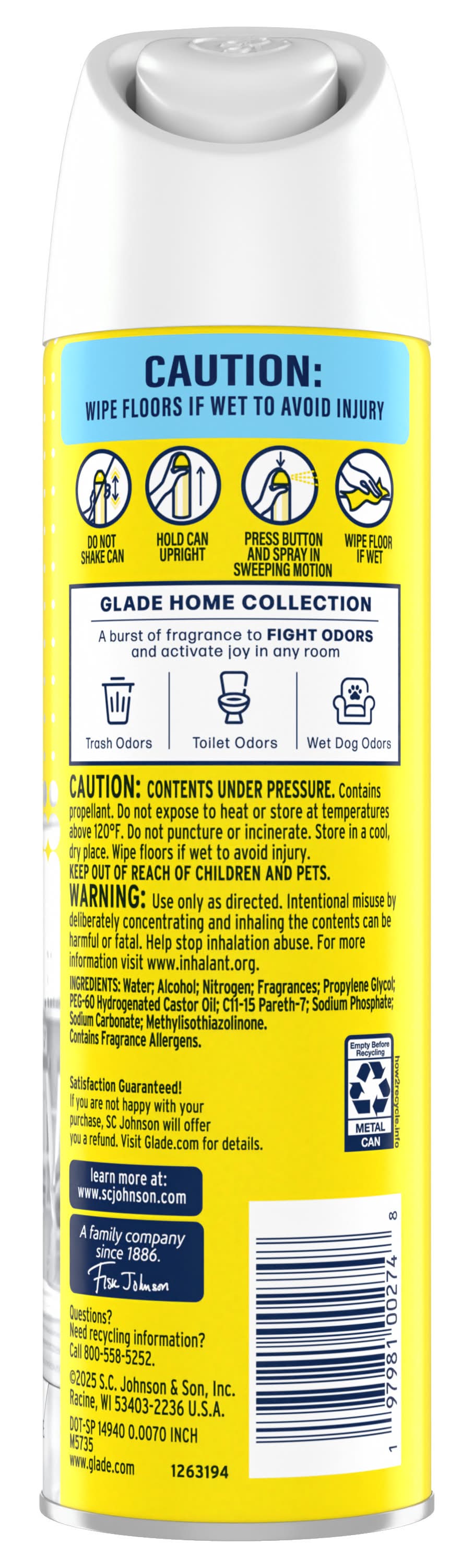 Glade air freshener spray fights odors to transform your living spaces with vibrant freshness. Crafted to elevate the energy of any room, this Glade air freshener for home instantly refreshes with a burst of bright freshly squeezed lemon and lemon zest. Tested and designed to fight every day odors such as trash, kitchen, and wet dog. A fresh burst of Glade fragrance to fight off odors and activate joy in any room. Powered by compressed gas technology, there is no need to shake the can before
