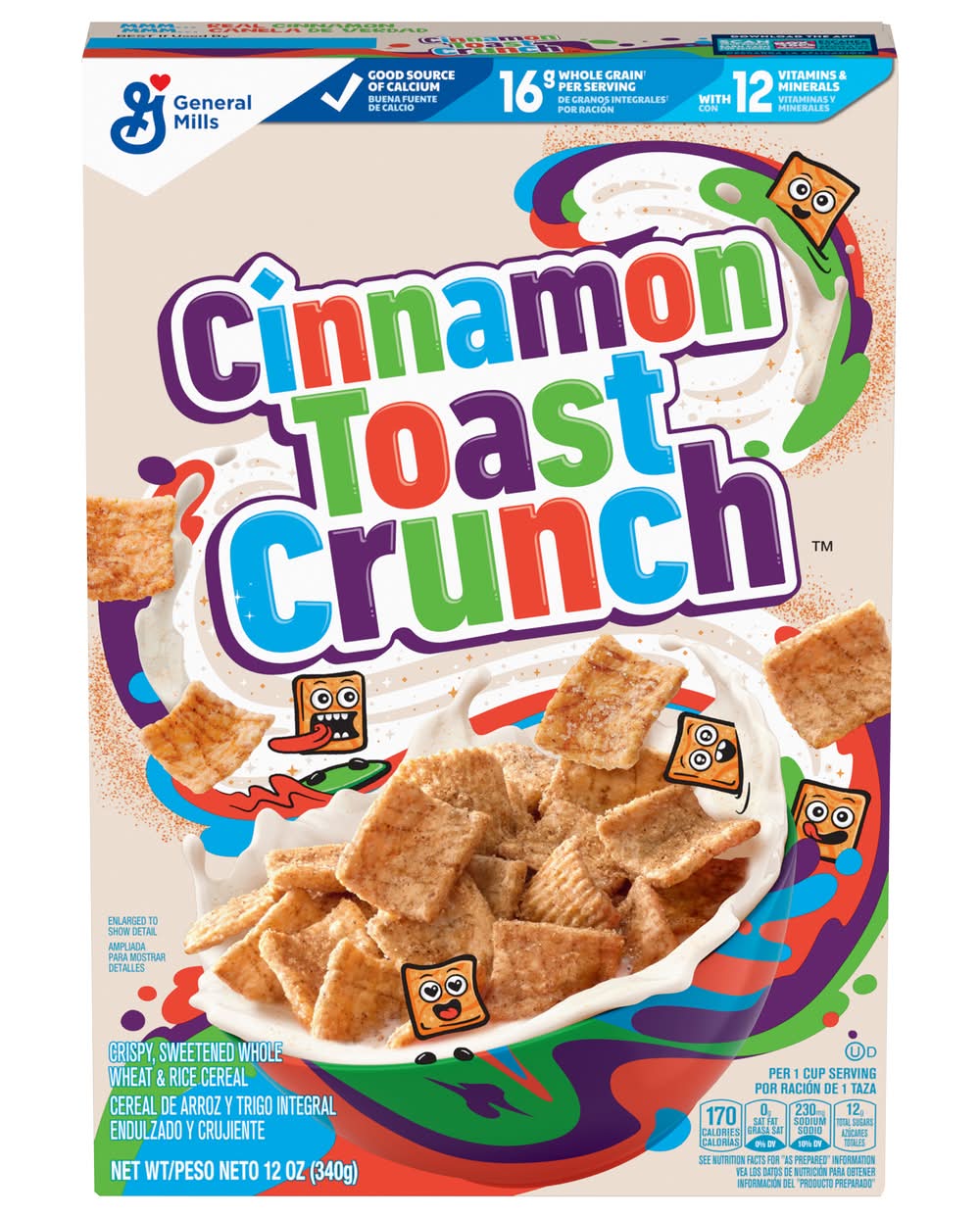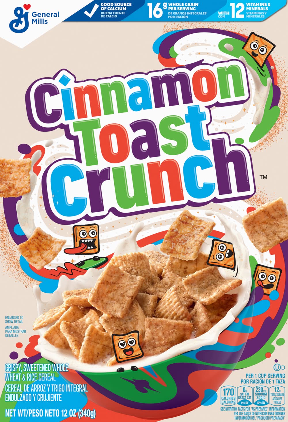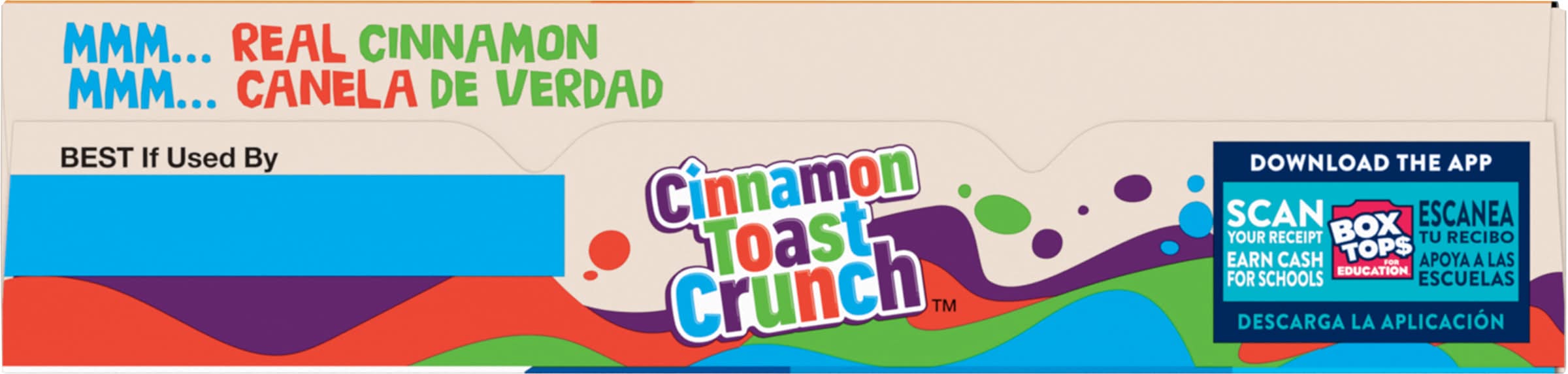 Get off to an epic start with Cinnamon Toast Crunch Cereal. Every crispy square is blasted that irresistible mix of real cinnamon and sugar. Enjoy this crispy, sweetened whole wheat and rice cereal as a ready to eat breakfast food. Simply pour a bowl of cold cereal with milk and dig into that satisfying crunch. Then slurp up the CINNAMILK, the sweet and awesomely tasty cereal milk at the bottom of your bowl. Every serving of this cinnamon cereal provides 16g whole grain (at least 48g recommended daily), 12 vitamins and minerals, and a good source of calcium. Make it a part of a quick and easy breakfast for teens, kids, and the entire family. Pack some in snack bags and enjoy this crispy cereal on the go. Add it to snack mix or cereal bars recipes for lunchbox snacks. Keep a box in your pantry for mornings or to use as a crispy ice cream topping. You can also sprinkle some cinnamon-y squares over frosted cupcakes and other desserts. Whether you're looking for delicious kids snacks, trail mix ingredients, or a breakfast cereal for everyone in your household, General Mills cereals spread goodness from tots to grown-ups. Contains one cardboard box of crunchy Cinnamon Toast Crunch Breakfast Cereal, Crispy Cinnamon Cereal; Perfect for instant snacking, or a part of breakfast and meals. • General Mills Sales, Inc., Minneapolis, MN, 55440 • Packaging: Reusable