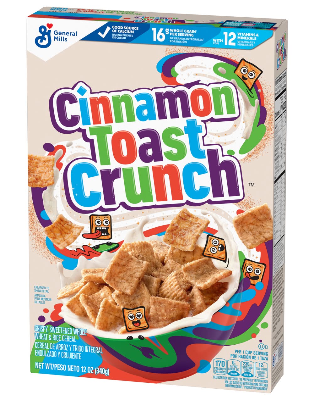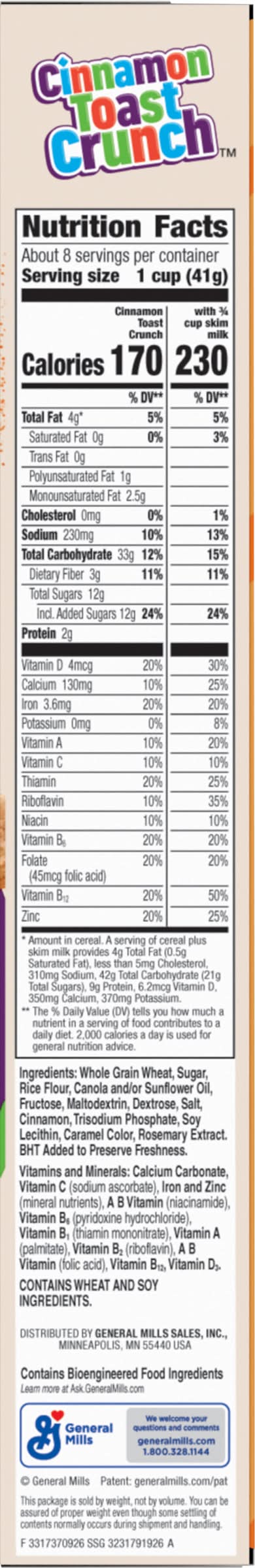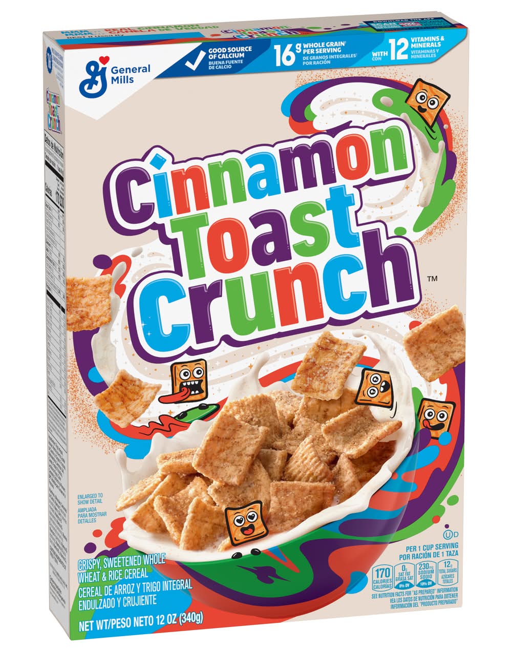 Get off to an epic start with Cinnamon Toast Crunch Cereal. Every crispy square is blasted that irresistible mix of real cinnamon and sugar. Enjoy this crispy, sweetened whole wheat and rice cereal as a ready to eat breakfast food. Simply pour a bowl of cold cereal with milk and dig into that satisfying crunch. Then slurp up the CINNAMILK, the sweet and awesomely tasty cereal milk at the bottom of your bowl. Every serving of this cinnamon cereal provides 16g whole grain (at least 48g recommended daily), 12 vitamins and minerals, and a good source of calcium. Make it a part of a quick and easy breakfast for teens, kids, and the entire family. Pack some in snack bags and enjoy this crispy cereal on the go. Add it to snack mix or cereal bars recipes for lunchbox snacks. Keep a box in your pantry for mornings or to use as a crispy ice cream topping. You can also sprinkle some cinnamon-y squares over frosted cupcakes and other desserts. Whether you're looking for delicious kids snacks, trail mix ingredients, or a breakfast cereal for everyone in your household, General Mills cereals spread goodness from tots to grown-ups. Contains one cardboard box of crunchy Cinnamon Toast Crunch Breakfast Cereal, Crispy Cinnamon Cereal; Perfect for instant snacking, or a part of breakfast and meals. • General Mills Sales, Inc., Minneapolis, MN, 55440 • Packaging: Reusable