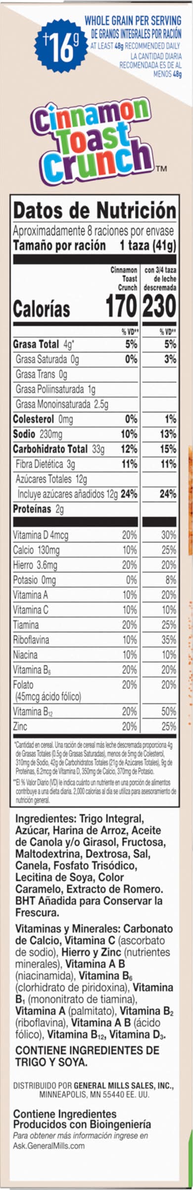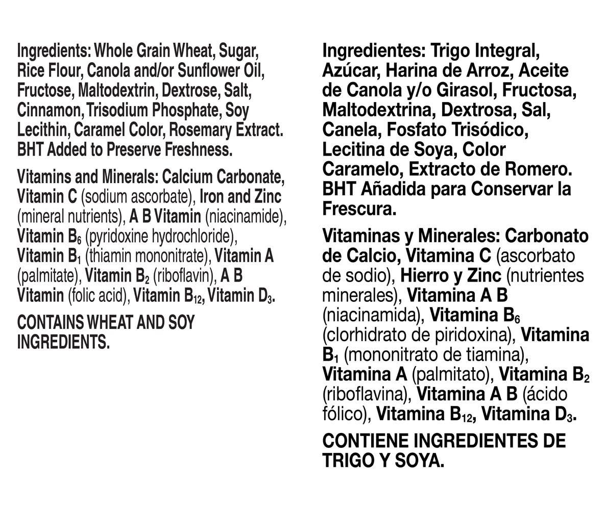 Ingredients: Whole Grain Wheat, Sugar, Rice Flour, Canola and/or Sunflower Oil, Fructose, Maltodextrin, Dextrose, Salt, Cinnamon, Trisodium Phosphate, Soy Lecithin, Caramel Color, Rosemary Extract, BHT Added to Preserve Freshness. Vitamins and Minerals: Calcium Carbonate, Vitamin C (Sodium Ascorbate), Iron and Zinc (Mineral Nutrients), a B Vitamin (Niacinamide), Vitamin B6 (Pyridoxine Hydrochloride), Vitamin B1 (Thiamin Mononitrate), Vitamin A (Palmitate), Vitamin B2 (Riboflavin), a B Vitamin (Folic Acid), Vitamin B12, Vitamin D3 Contains: Wheat, Soybeans