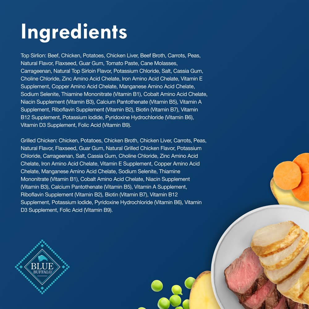 Ingredients: Top Sirloin:Beef, Chicken, Potatoes, Chicken Liver, Beef Broth, Carrots, Peas, Natural Flavor, Flaxseed, Guar Gum, Tomato Paste, Cane Molasses, Carrageenan, Natural Top Sirloin Flavor, Potassium Chloride, Salt, Cassia Gum, Choline Chloride, Zinc Amino Acid Chelate, Iron Amino Acid Chelate, Vitamin E Supplement, Copper Amino Acid Chelate, Manganese Amino Acid Chelate, Sodium Selenite, Thiamine Mononitrate (Vitamin B1), Cobalt Amino Acid Chelate, Niacin Supplement (Vitamin B3), Calcium Pantothenate (Vitamin B5), Vitamin A Supplement, Riboflavin Supplement (Vitamin B2), Biotin (Vitamin B7), Vitamin B12 Supplement, Potassium Iodide, Pyridoxine Hydrochloride (Vitamin B6), Vitamin D3 Supplement, Folic Acid (Vitamin B9), Grilled Chicken:Chicken, Potatoes, Chicken Broth, Chicken Liver, Carrots, Peas, Natural Flavor, Flaxseed, Guar Gum,, Natural Grilled Chicken Flavor, Potassium Chloride, Carrageenan, Salt, Cassia Gum, Choline Chloride, Zinc Amino Acid Chelate, Iron Amino Acid Chelate, Vitamin E Supplement, Copper Amino Acid Chelate, Manganese Amino Acid Chelate, Sodium Selenit, Thiamine Mononitrate (Vitamin B1), Cobalt Amino Acid Chelate, Niacin Supplement (Vitamin B3), Calcium Pantothenate (Vitamin B5), Vitamin A Supplement, Riboflavin Supplement (Vitamin B2), Biotin (Vitamin B7, Vitamin B12 Supplement, Potassium Iodide, Pyridoxine Hydrochloride (Vitamin B6), Vitamin D3 Supplement, Folic Acid (Vitamin B9)