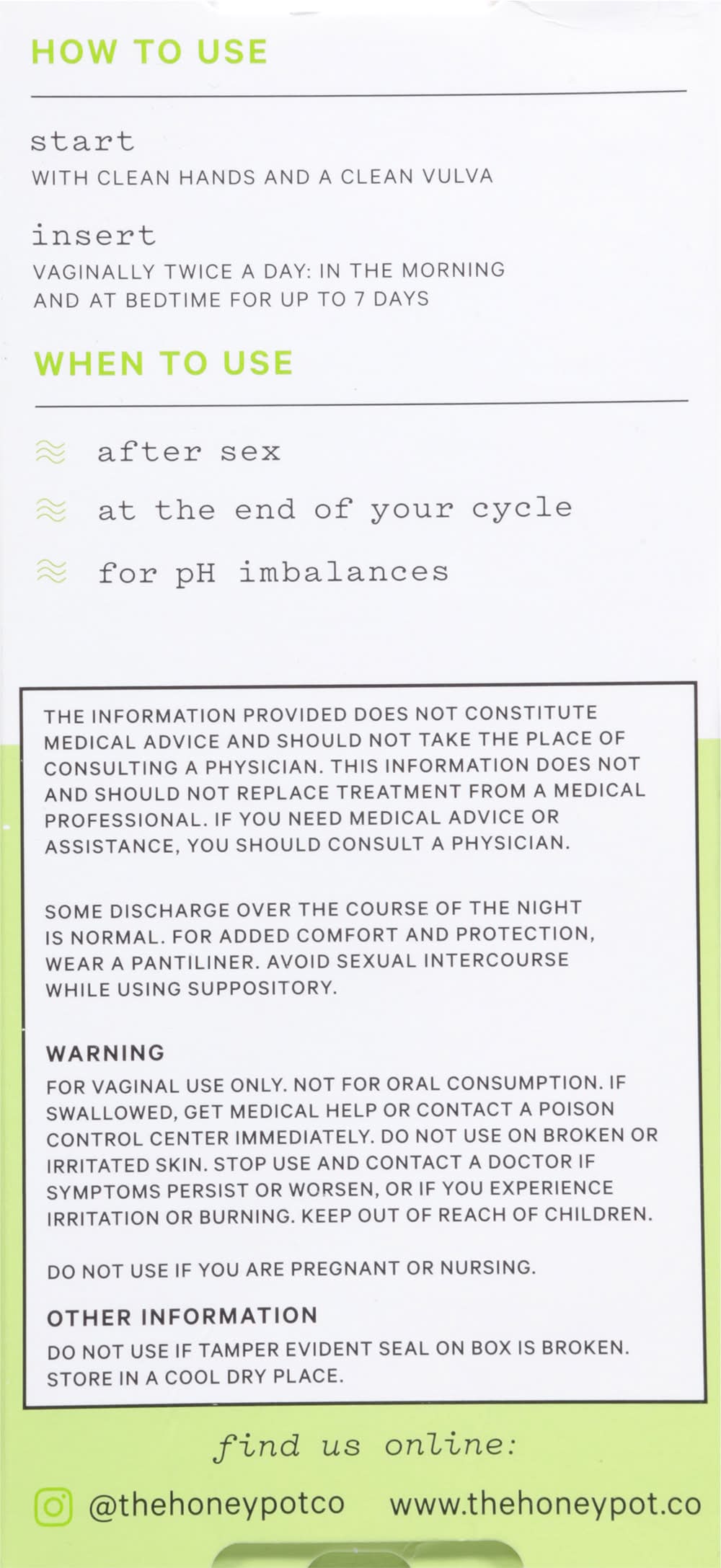 How to use start with a clean vagina insert vaginally twice a day in the morning and at bedtime for 7 days when to use after sex semen has a ph of 7.1-8 at the end of your cycle ph tends to be around 7.4 for hormonal imbalances your vagina's ph should be between 3.8 and 4.5 some discharge over the course of the night is normal. for added comfort and protection, wear a honey pot herbal pantiliner. avoid sexual intercourse while using suppository.