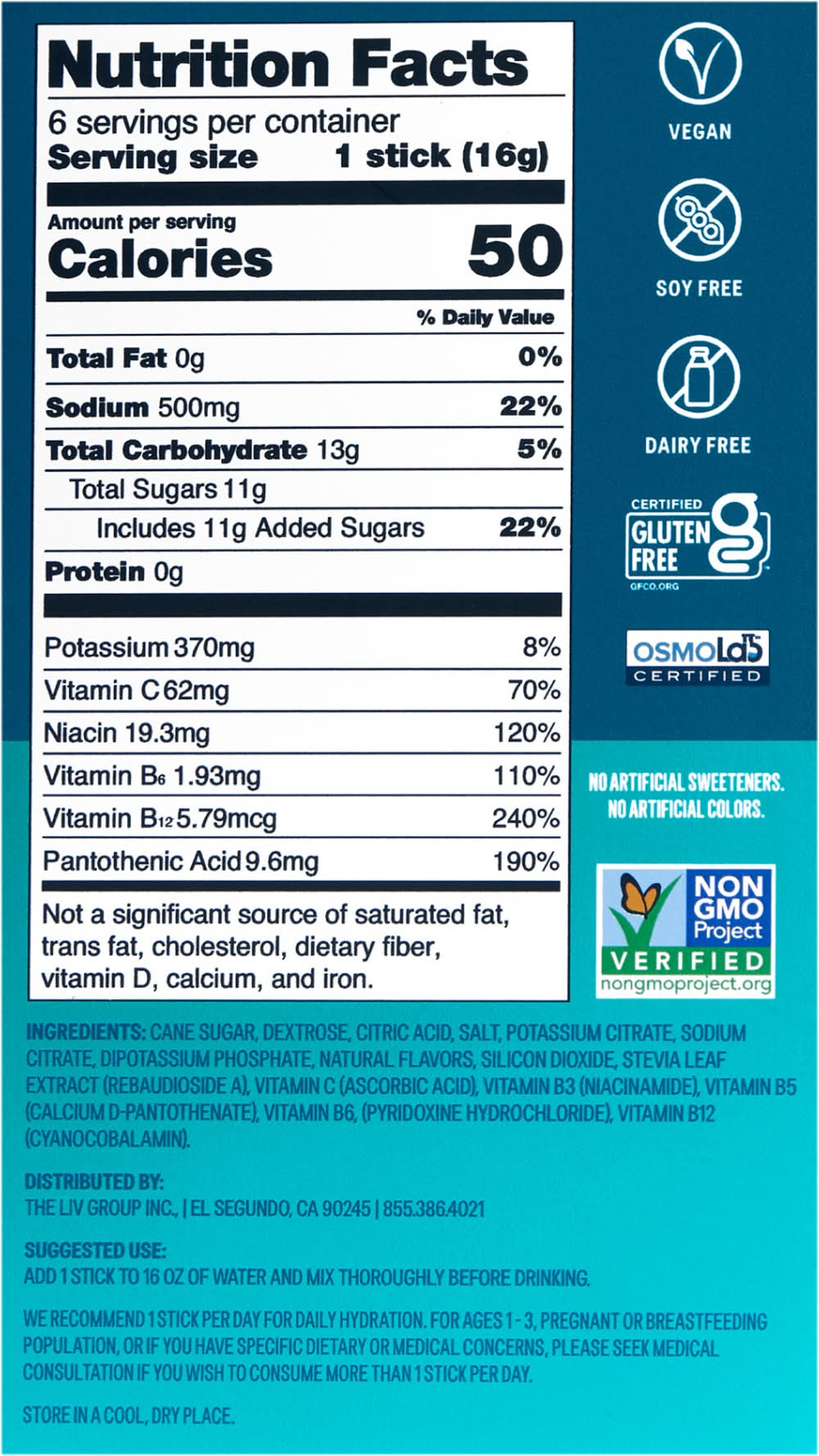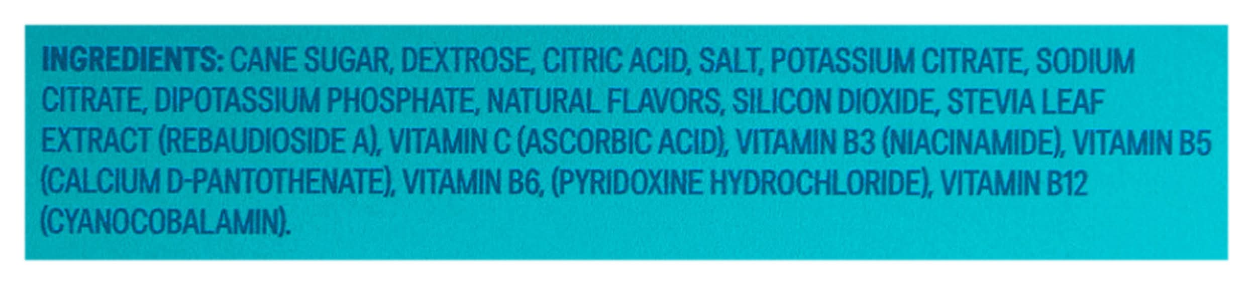 Ingredients: Cane Sugar, Dextrose, Citric Acid, Salt, Potassium Citrate, Sodium Citrate, Dipotassium Phosphate, Natural Flavors, Silicon Dioxide, Stevia Leaf Extract (Rebaudioside a), Vitamin C (Ascorbic Acid), Vitamin B3 (Niacinamide), Vitamin B5 (Calcium D-Pantothenate), Vitamin B6, (Pyridoxine Hydrochloride), Vitamin B12 (Cyanocobalamin)