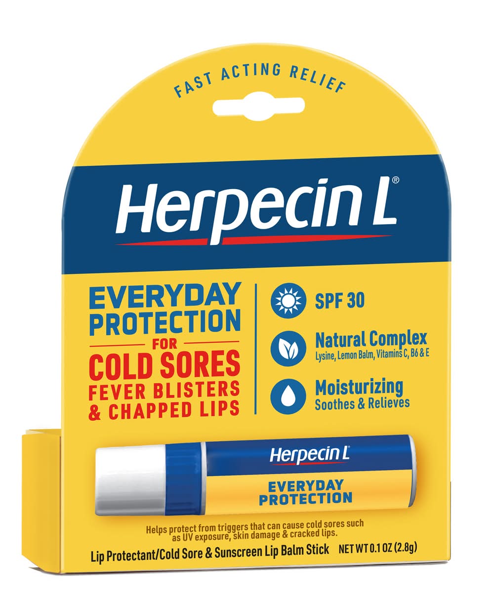 Herpecin-L Lip Protectant Cold Sore & Sunscreen Lip Balm provides relief and protection for lips affected by cold sores, sun and fever blisters, as well as chapped lips. It is enriched with lysine and vitamins C and B6 to support lip health. Suitable for daily use, this lip balm is formulated for ease of application. The product is manufactured in Canada and contains essential information on its packaging. Focus Consumer Healthcare, LLC., 801 Broad Street,Chattanooga,TN,37402