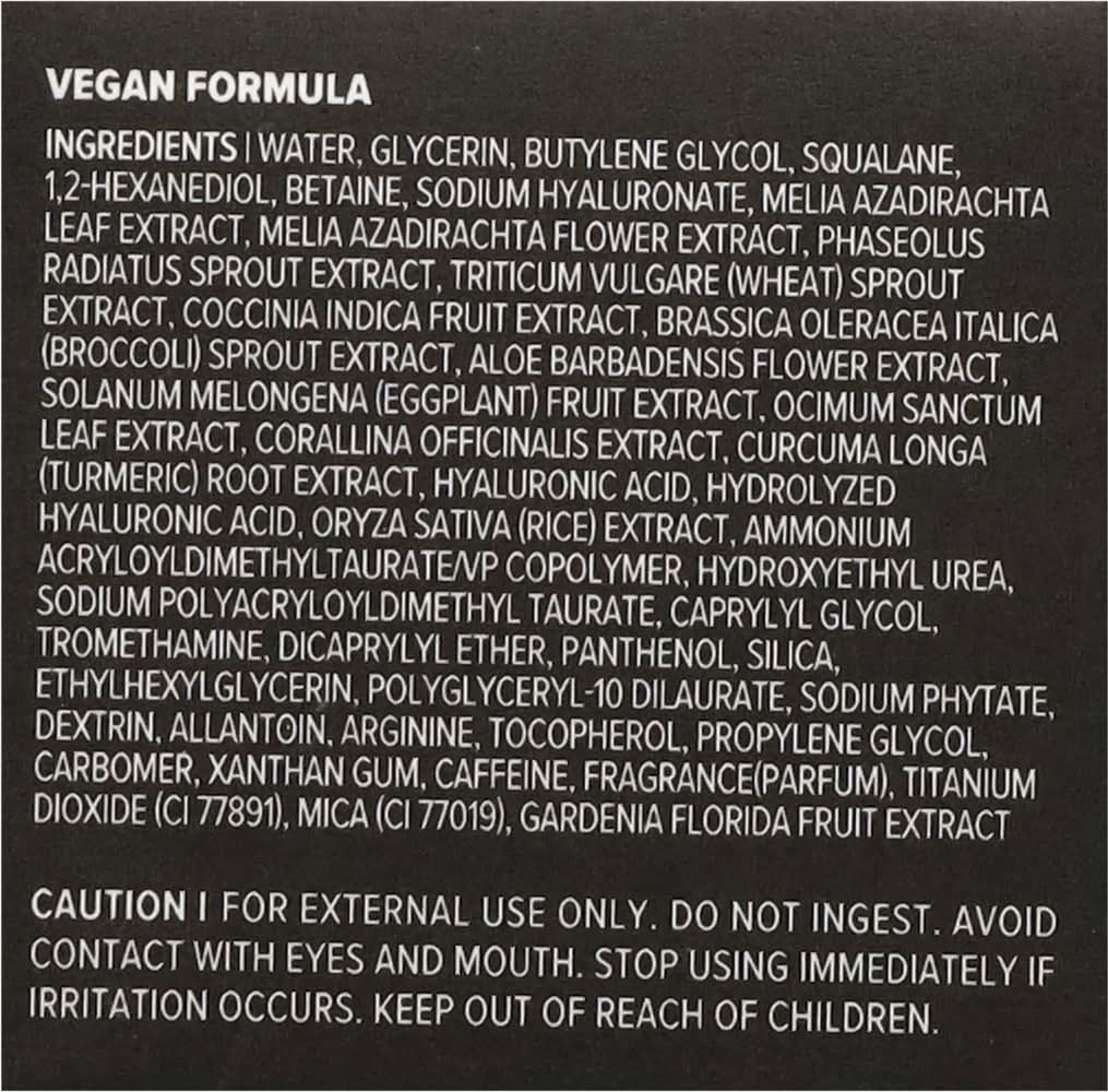 Ingredients: Water, Glycerin, Butylene Glycol, Squalane, 1, 2-Hexanediol, Betaine, Sodium Hyaluronate, Melia Azadirachta Leaf Extract, Melia Azadirachta Flower Extract, Phaseolus Radiatus Sprout Extract, Triticum Vulgare (Wheat) Sprout Extract, Coccinia Indica Fruit Extract, Brassica Oleracea Italica (Broccoli) Sprout Extract, Aloe Barbadensis Flower Extract, Solanum Melongena (Eggplant) Fruit Extract, Ocimum Sanctum Leaf Extract, Corallina Officinalis Extract, Curcuma Longa (Turmeric) Root Extract, Hyaluronic Acid, Hydrolyzed Hyaluronic Acid, Oryza Sativa (Rice) Extract, Ammonium Acryloyldimethyltaurate/VP Copolymer, Hydroxyethyl Urea, Sodium Polyacryloyldimethyl Taurate, Caprylyl Glycol, Tromethamine, Dicaprylyl Ether, Panthenol, Silica, Ethylhexylglycerin, Polyglyceryl-10 Dilaurate, Sodium Phytate, Dextrin, Allantoin, Arginine, Tocopherol, Propylene Glycol, Carbomer, Xanthan Gum, Caffeine, Fragrance(Parfum), Titanium Dioxide (CI 77891), Mica (CI 77019), Gardenia Florida Fruit Extract Contains: Wheat