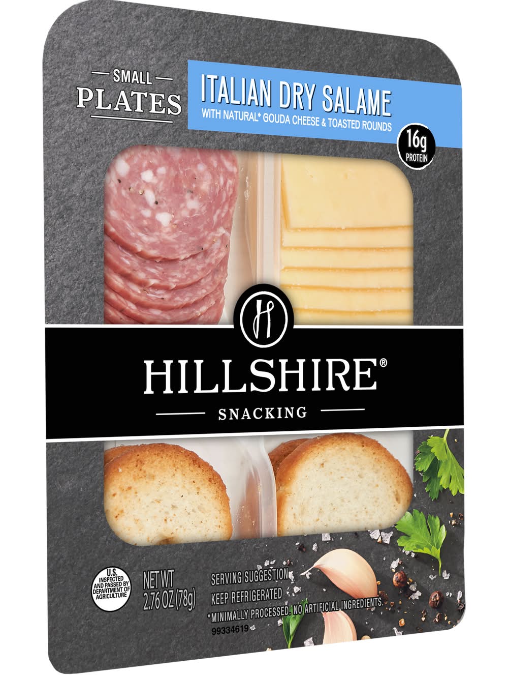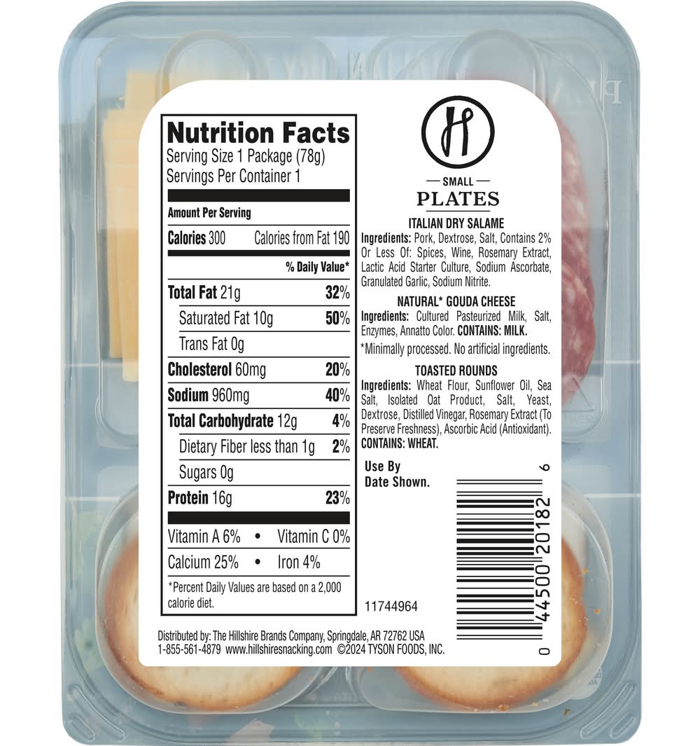 Hillshire Snacking Small Plates for a grown up twist on snack time. Our Italian dry salami snack pack features Italian dry sliced salami, natural Gouda cheese slices, and crisp toasted rounds. Perfectly portioned for snacking on the go, our Italian Dry Salami Small Plate has 16 grams of protein in each ready to eat serving. • Flavor: Italian dry salame • The Hillshire Brands Company, Chicago, IL, 60607