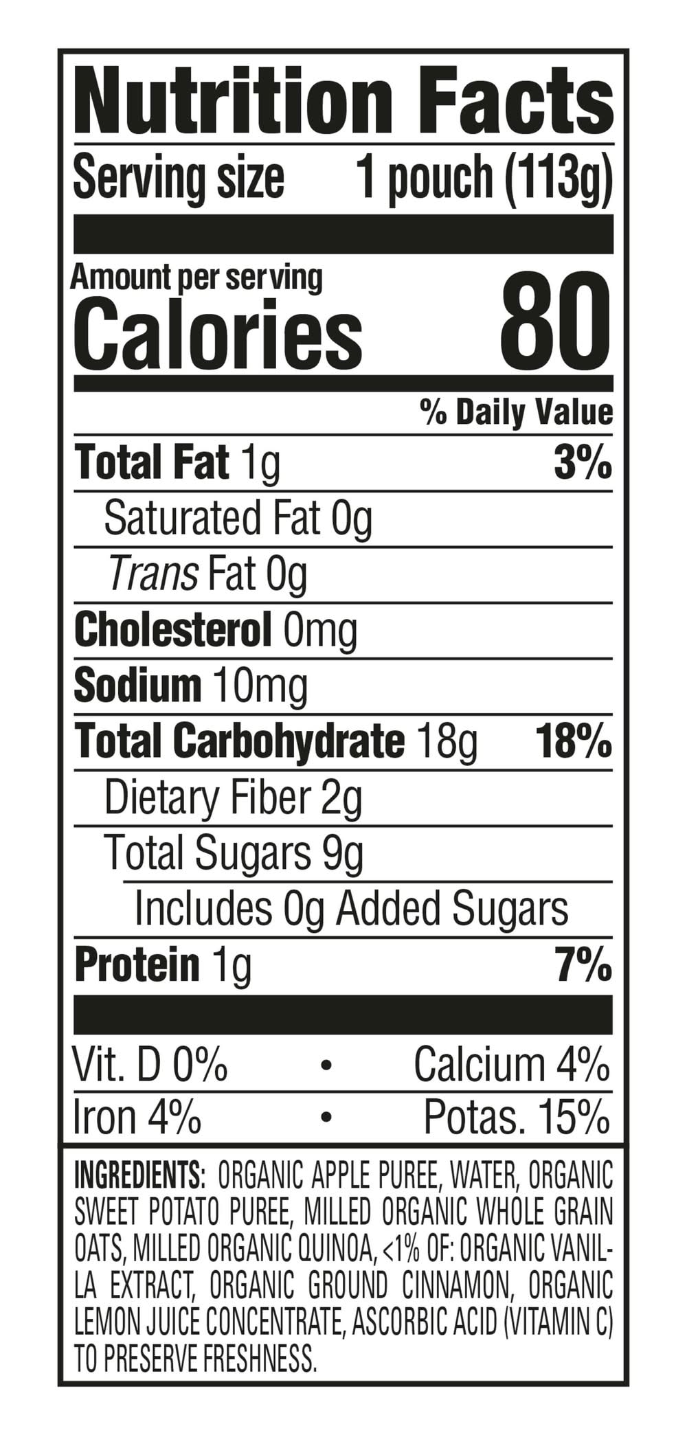 Ingredients: Organic Apple Puree, Water, Organic Sweet Potato Puree, Organic Whole Grain Rolled Oats, Milled Organic Quinoa, Less than 1% of: Organic Vanilla Extract, Organic Ground Cinnamon, Organic Lemon Juice Concentrate, Ascorbic Acid (to Preserve Freshness)