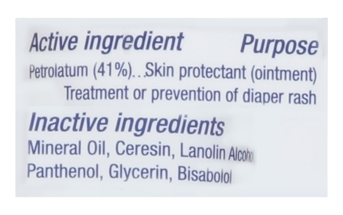 Ingredients: Active Ingredients: Petrolatum (41 %), Skin Protectant (Ointment) Treatment or Prevention of Diaper Rash. Inactive Ingredients: Mineral Oil, Ceresin, Lanolin Alcohol, Panthenol, Glycerin, Bisabolol Additives: Mineral Oil, Ceresin, Lanolin Alcohol, Panthenol, Glycerin, Bisabolol