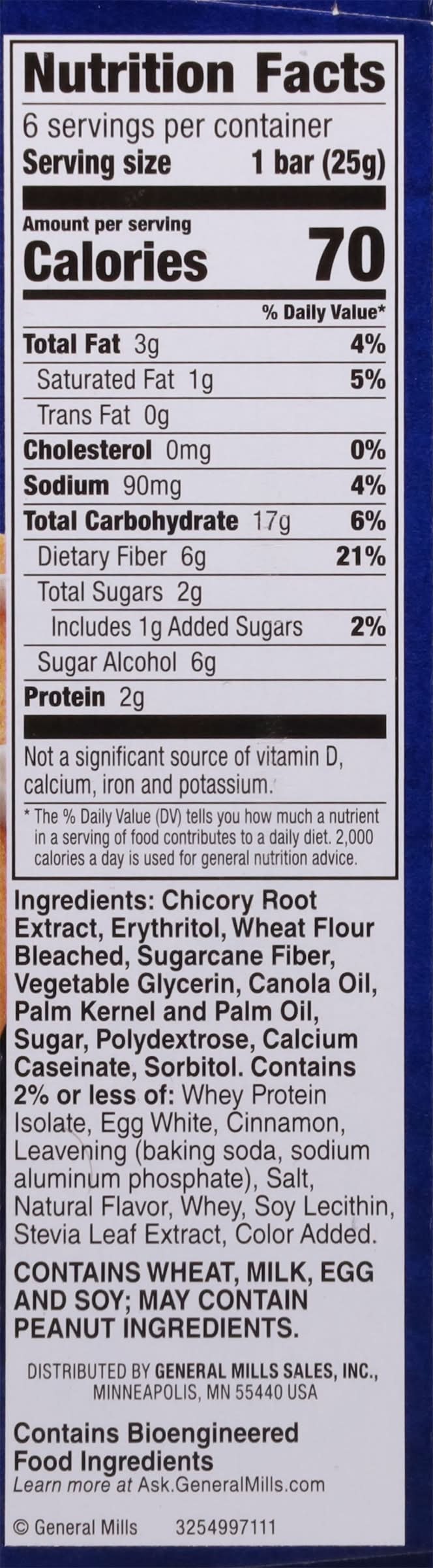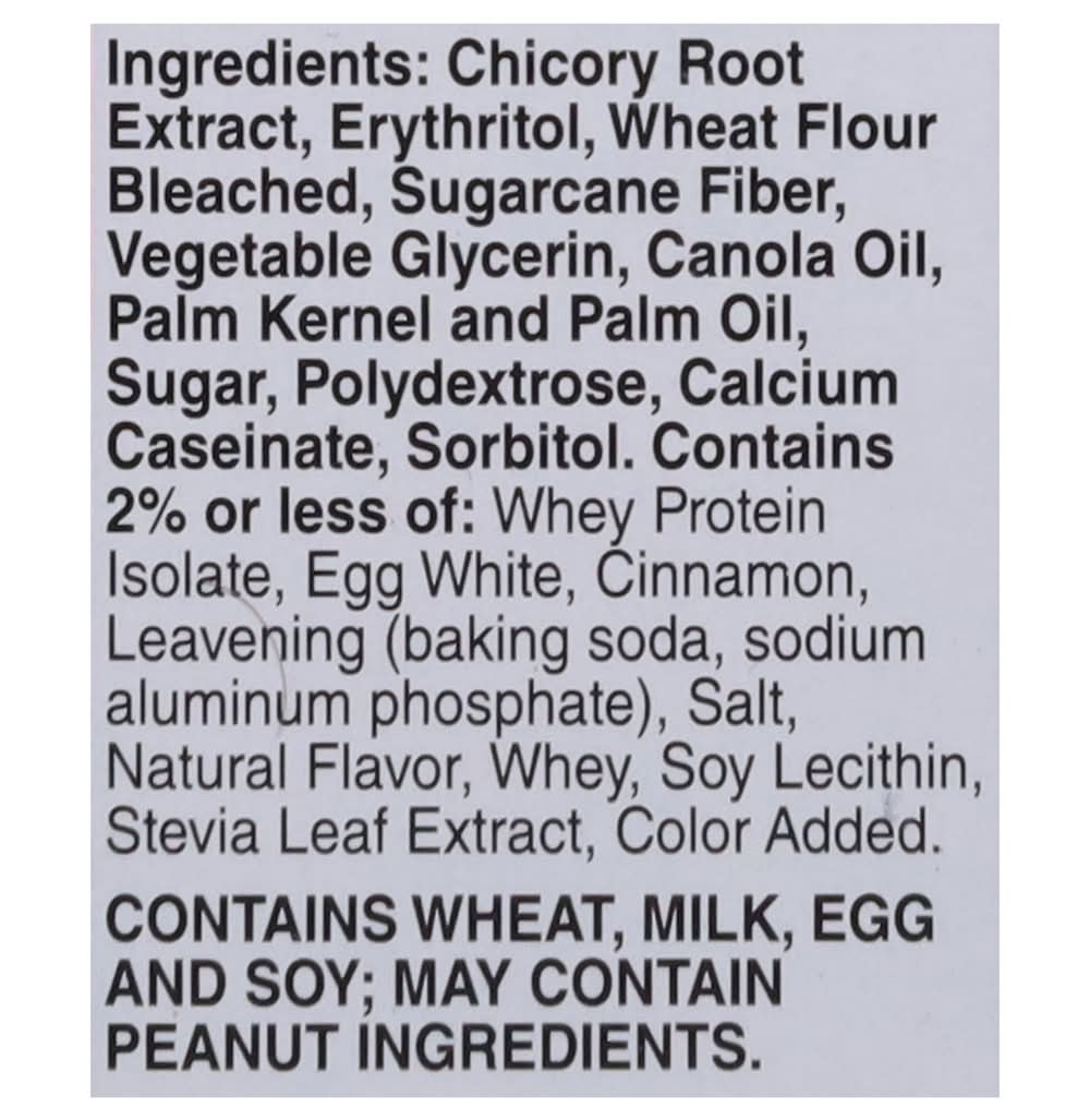 Ingredients: Chicory Root Extract, Erythritol, Wheat Flour Bleached, Sugarcane Fiber, Vegetable Glycerin, Canola Oil, Palm Kernel and Palm Oil, Sugar, Polydextrose, Calcium Caseinate, Sorbitol, Contains 2% or Less of: Whey Protein Isolate, Egg White, Cinnamon, Leavening (Baking Soda, Sodium Aluminum Phosphate), Salt, Natural Flavor, Whey, Soy Lecithin, Stevia Leaf Extract, Color Added Contains: Wheat, Eggs, Soybeans, Milk, Peanuts Additives: Genetically Modified Ingredients