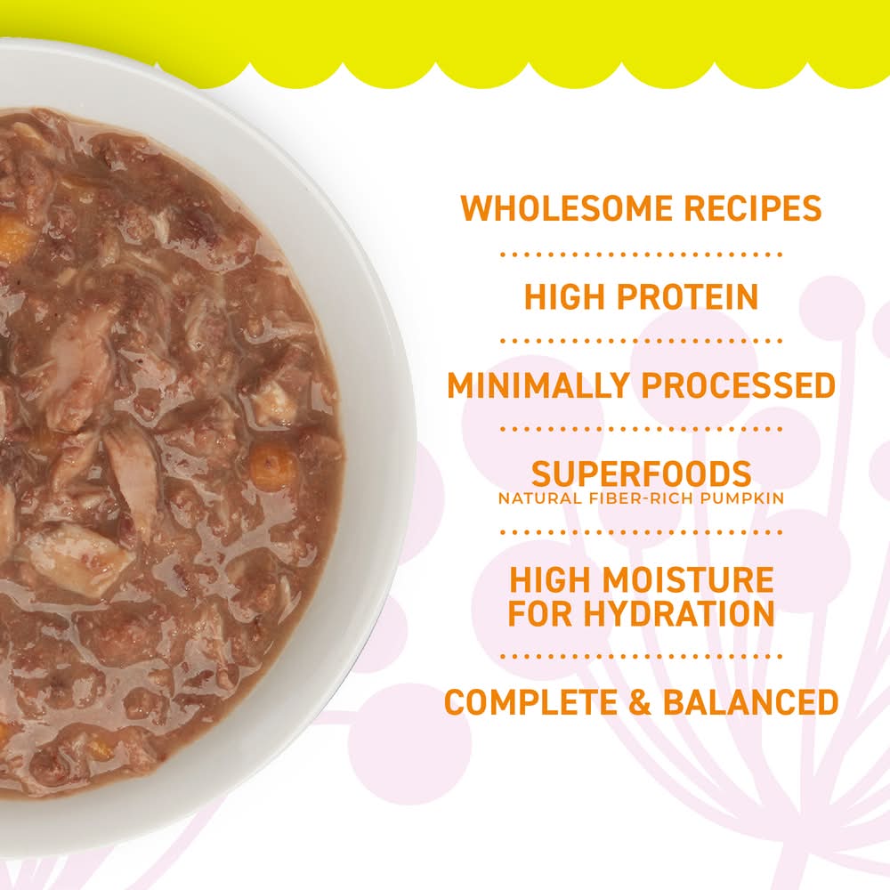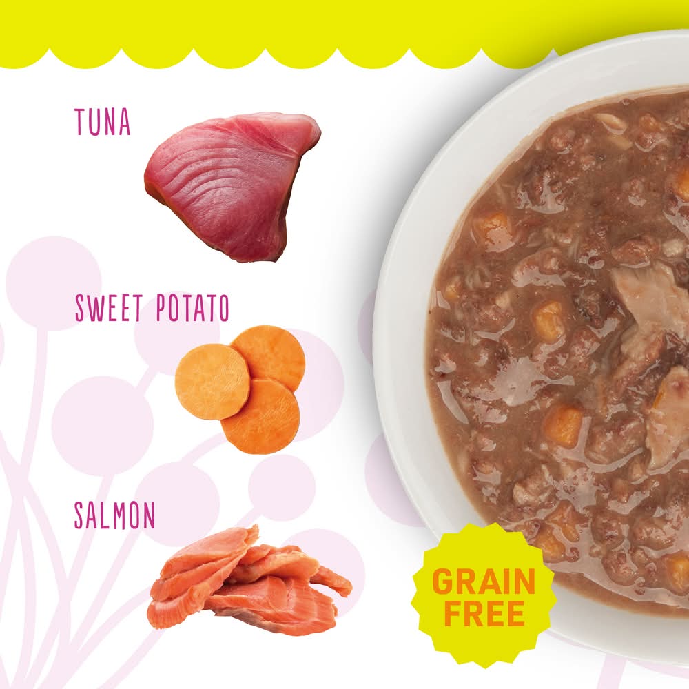 Aunt Molly's Tuna with Sweet Potato and Salmon Entree in broth is made with flaked tuna and salmon and chunks of sweet potato for a high protein, grain-free wholesome meal. Product of Thailand Packaging: Reusable