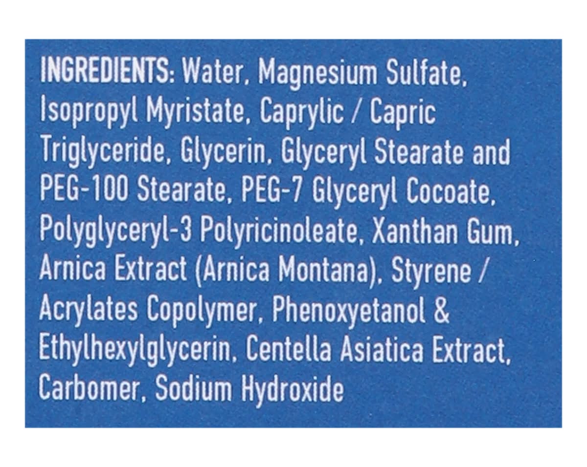 Ingredients: Water, Magnesium Sulfate, Isopropyl Myristate, Caprylic/Capric Triglyceride, Glycerin, Glyceryl Stearate and PEG-100 Stearate, PEG-7 Glyceryl Cocoate, Polyglyceryl-3 Polyricinoleate, Xanthan Gum, Arnica Extract (Arnica Montana), Styrene/Acrylates Copolymer, Phenoxyetanol & Ethylhexylglycerin, Centella Asiatica Extract, Carbomer, Sodium Hydroxide