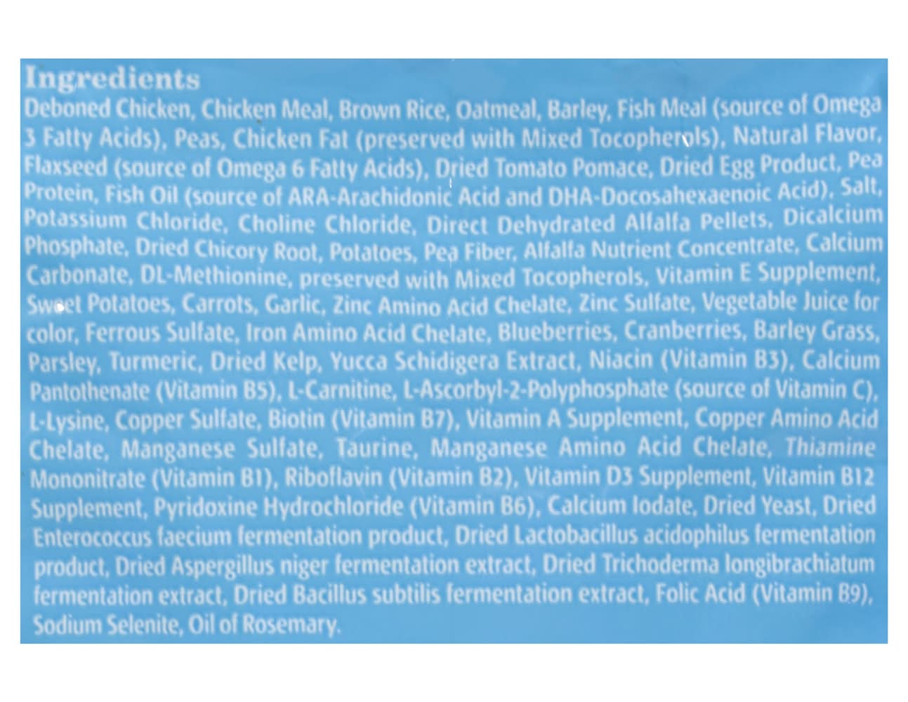 Ingredients: Deboned Chicken, Chicken Meal, Brown Rice, Oatmeal, Barley, Fish Meal (Source of Omega 3 Fatty Acids), Chicken Fat (Preserved with Mixed Tocopherols), Dried Tomato Pomace, Peas, Natural Flavor, Flaxseed (Source of Omega 6 Fatty Acids), Dried Egg Product, Dried Yeast, Fish Oil (Source of ARA-Arachidonic Acid and DHA-Docosahexaenoic Acid), Salt, Potassium Chloride, Choline Chloride, Direct Dehydrated Alfalfa Pellets, Dicalcium Phosphate, Dried Chicory Root, Alfalfa Nutrient Concentrate, Calcium Carbonate, L-Threonine, DL-Methionine, Preserved with Mixed Tocopherols, Vitamin E Supplement, Dried Sweet Potatoes, Carrots, Zinc Amino Acid Chelate, Zinc Sulfate, Vegetable Juice for Color, Ferrous Sulfate, Iron Amino Acid Chelate, Blueberries, Cranberries, Barley Grass, Parsley, Turmeric, Dried Kelp, Yucca Schidigera Extract, Niacin (Vitamin B3), Copper Sulfate, Calcium Pantothenate (Vitamin B5), L-Ascorbyl-2-Polyphosphate (Source of Vitamin C), L-Lysine, Biotin (Vitamin B7), Vitamin a Supplement, Copper Amino Acid Chelate, Manganese Sulfate, Taurine, Manganese Amino Acid Chelate, Thiamine Mononitrate (Vitamin B1), Riboflavin (Vitamin B2), Vitamin D3 Supplement, Vitamin B12 Supplement, Pyridoxine Hydrochloride (Vitamin B6), Calcium Lodate, Folic Acid (Vitamin B9), Sodium Selenite, Oil of Rosemary Contains: Oat, Barley, Fish, Eggs