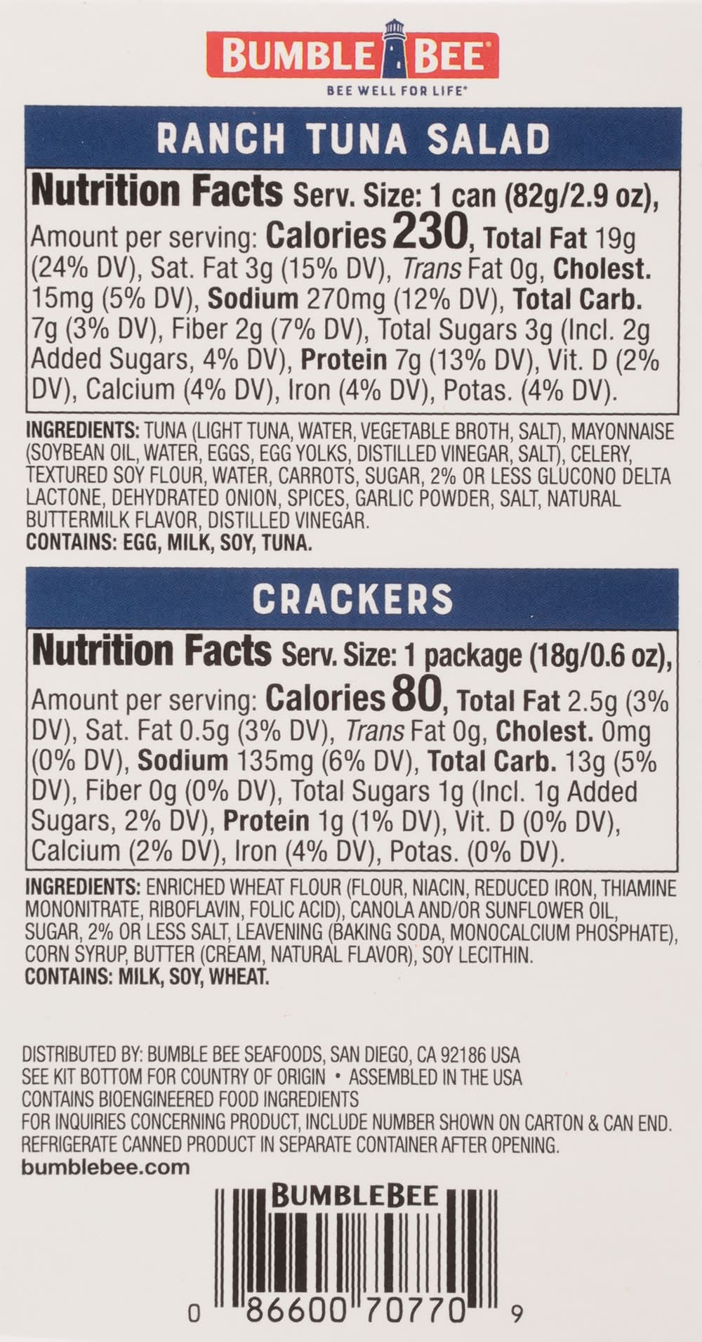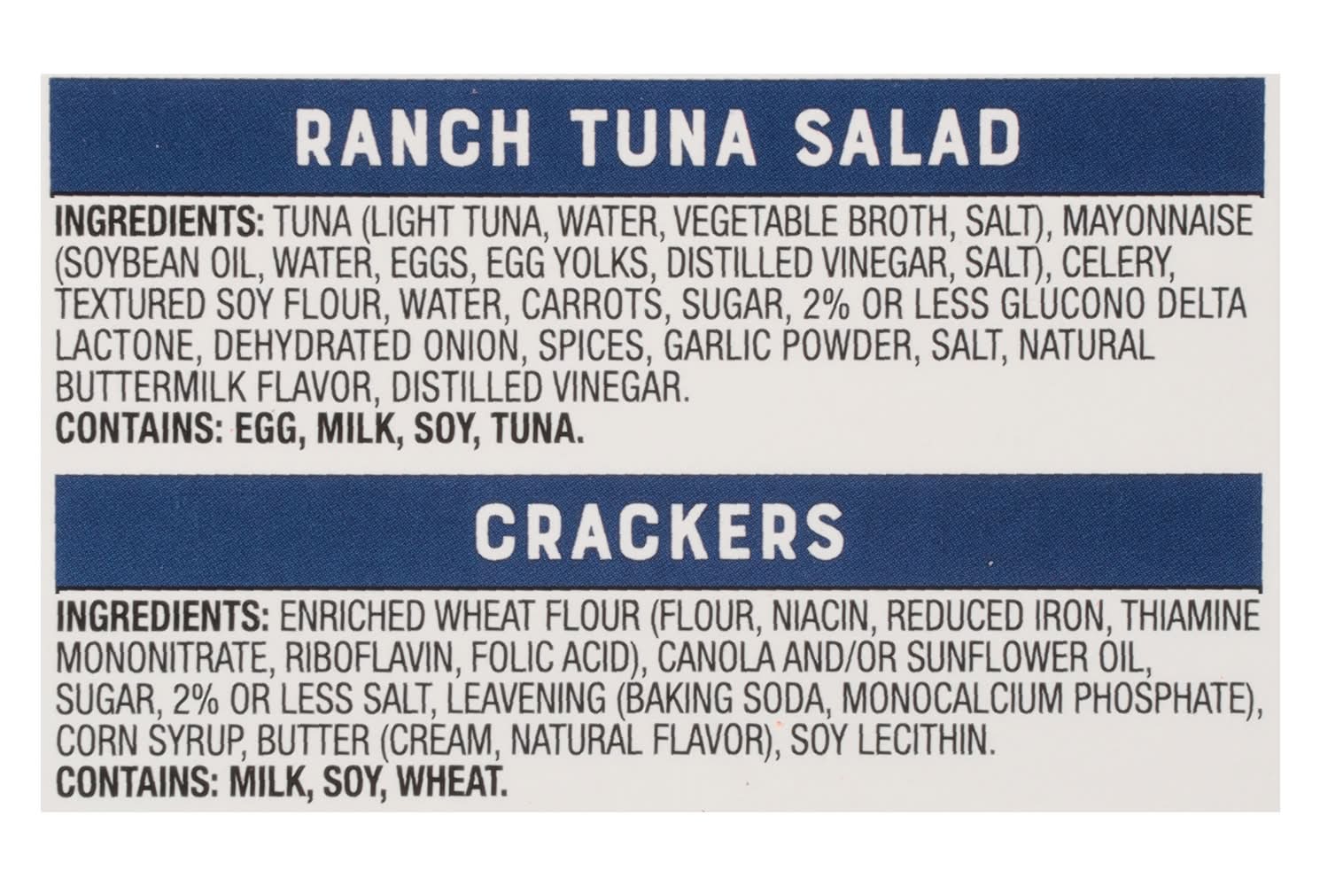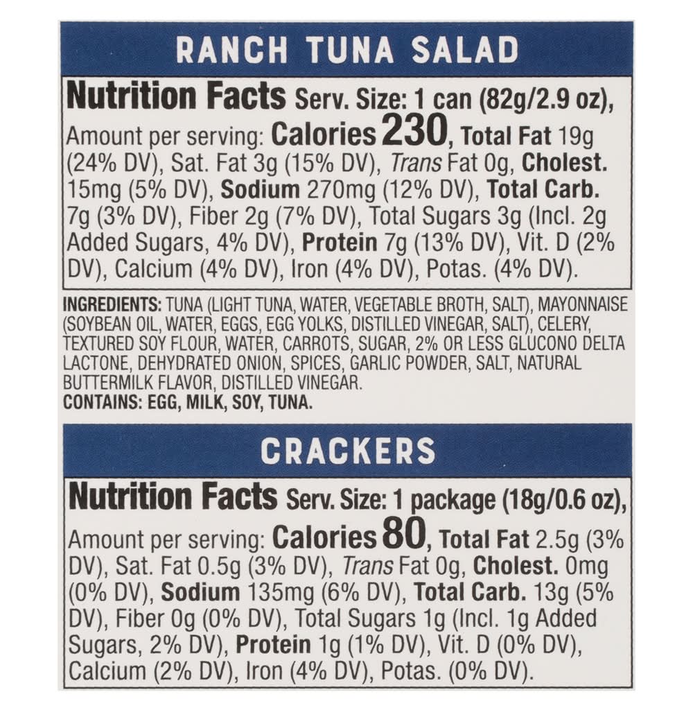Ingredients: Ranch Tuna Salad: Tuna (Light Tuna, Water, Vegetable Broth, Salt), Mayonnaise (Soybean Oil, Water, Eggs, Egg Yolks, Distilled Vinegar, Salt), Celery, Textured Soy Flour, Water, Carrots, Sugar, 2% or Less Glucono Delta Lactone, Dehydrated Onion, Spices, Garlic Powder, Salt, Natural Buttermilk Flavor, Distilled Vinegar. Crackers: Enriched Wheat Flour (Flour, Niacin, Reduced Iron, Thiamine Mononitrate, Riboflavin, Folic Acid), Canola and/or Sunflower Oil, Sugar, 2% or Less Salt, Leaving (Baking Soda, Monocalcium Phosphate), Corn Syrup, Butter (Cream, Natural Flavor), Soy Lecithin. Contains: Eggs, Milk, Soybeans, Fish, Tuna, Celery, Wheat, Corn