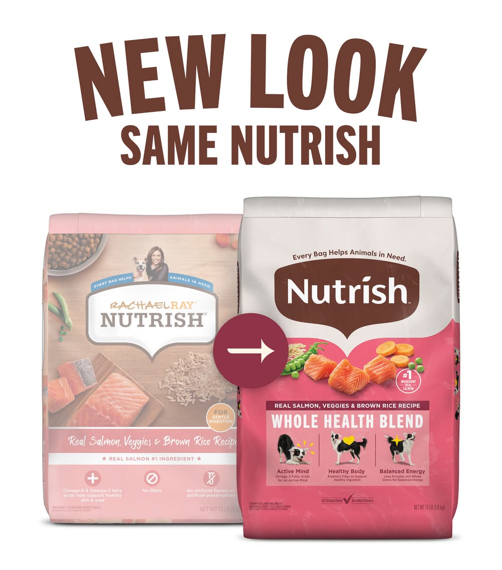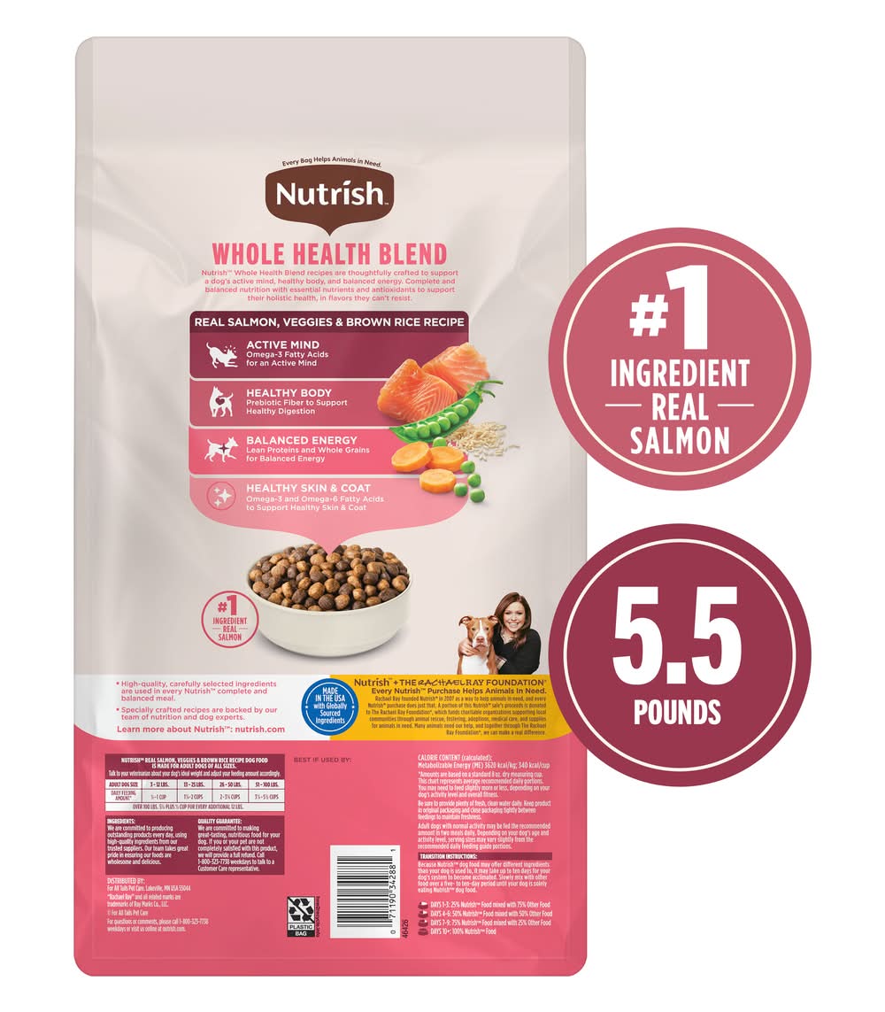 Rachael ray nutrish real salmon, veggies & brown rice dog food is made for all dogs of all sizes. talk to your veterinarian about your dog's ideal weight and adjust your feeding amount accordingly. adult dog size - 3-12 lbs; daily feeding amount amounts are based on a standard 8 oz. dry measuring cup. this cart represents average recommended daily portions. you may need to feed slightly more or less depending on your dog's activity level and overall fitness) - 1/2-1 cup; adult dog size: 13-25 lbs; daily feeding amount (amounts are based on a standard 8 oz. dry measuring cup. this cart represents average recommended daily portions. you may need to feed slightly more or less depending on your dog's activity level and overall fitness) - 1-2 cups; adult dog size - 26-50 lbs; daily feeding amount (amounts are based on a standard 8 oz. dry measuring cup. this cart represents average recommended daily portions. you may need to feed slightly more or less depending on your dog's activity level and overall fitness) - 2-3 1/4 cups; adult dog size - 51-10 lbs; daily feeding amount (amounts are based on a standard 8 oz. dry measuring cup. this cart represents average recommended daily portions. you may need to feed slightly more or less depending on your dog's activity level and overall fitness) - 3 1/4-5 1/2 cups. be sure to provide plenty of fresh, clean water daily. keep product in original packaging and close package tightly between feedings or store in an airtight container to maintain freshness. adult dogs: adult dogs with normal activity may be fed the recommended amount in two meals daily. depending on your dog's age and activity level. serving sizes may vary slightly from the recommended daily feeding guide portions. transition instructions: because rachael ray nutrish dog food may differ different ingredients than your dog is used to, it may take up to ten days for your dog's system to become acclimated. slowly mix with other food over a five-to ten-day period until your dog is solely eating rachael ray nutrish dog food. days 1-3: 25% nutrish food mixed with 75% other food. days 4-6: 50% nutrish food mixed with 50% other food. days 7-9: 75% nutrish food mixed with other food. days 10+: 100% nutrish food.