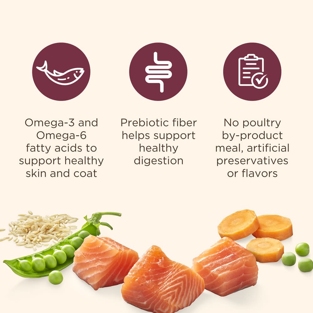 Ingredients: Salmon, Chicken Meal, Ground Whole Corn, Dried Peas, Grain Sorghum, Soybean Meal, Corn Protein Meal, Chicken Fat (Preserved with Mixed Tocopherols), Brown Rice, Dried Plain Beet Pulp, Flaxseed, Whole Millet, Dried Carrots, Dicalcium Phosphate, Natural Flavor, Malted Barley Flour, Salt, Calcium Carbonate, Taurine, Choline Chloride, Vitamins (Vitamin E Supplement, L - Ascorbyl - 2 - Polyphosphate (Source of Vitamin C), Niacin Supplement, Vitamin A Supplement, Thiamine Mononitrate, d - Calcium Pantothenate, Riboflavin Supplement, Pyridoxine Hydrochloride, Vitamin B12 Supplement, Folic Acid, Biotin, Vitamin D3 Supplement), Minerals (Ferrous Sulfate, Zinc Sulfate, Copper Sulfate, Sodium Selenite, Manganese Sulfate, Calcium Iodate), Zinc Sulfate, Citric Acid (Preservative), Rosemary Extract