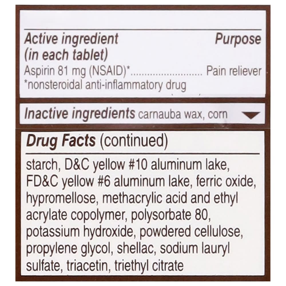 Ingredients: Active Ingredients: Aspirin 81 mg (NSAID) (nonsteroidal anti-inflammatory drug) (81 mg), Pain Reliever. Inactive Ingredients: Carnauba Wax, Corn Starch, D&C Yellow 10 Aluminum Lake, FD&C Yellow 6 Aluminum Lake, Ferric Oxide, Hypromellose, Methacrylic Acid And Ethyl Acrylate Copolymer, Polysorbate 80, Potassium Hydroxide, Powdered Cellulose, Propylene Glycol, Shellac, Sodium Lauryl Sulfate, Triacetin, Triethyl Citrate Additives: Black Iron Oxide Brown Iron Oxide, Carnauba Wax Corn Starch D&C Yellow 10 Aluminum Lake, FD&C Yellow 6 Aluminum Lake Hypromellose Methacrylic Acid Copolymer, Type C Polysorbate 80, Powdered Cellulose Propylene Glycol, Shellac, Sodium Lauryl Sulfate, Triacetin, Triethyl Citrate.
