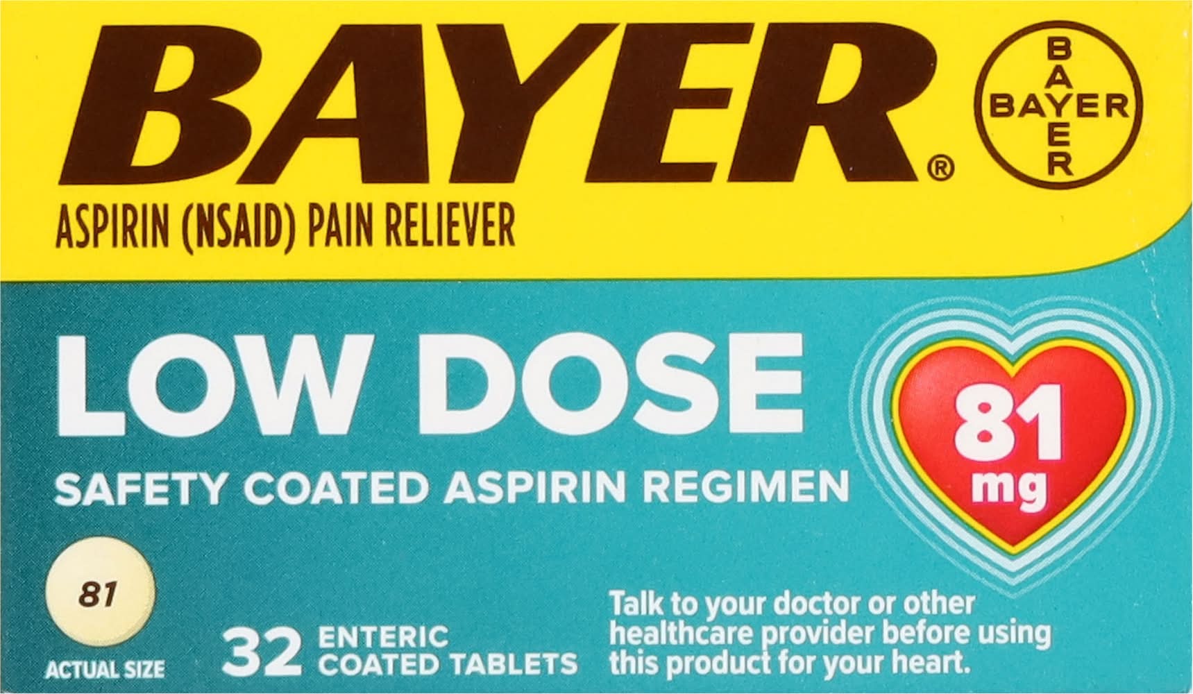 Safety coated Aspirin regimen. Talk to your doctor or other healthcare provider before using this product for your heart. Bayer consumer care, Whippany, NJ 07981,