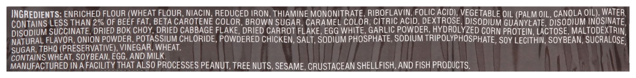 Ingredients: Enriched Flour (Wheat Flour, Niacin, Reduced Iron, Thiamine Mononitrate, Riboflavin, Folic Acid), Vegetable Oil (Palm Oil, Canola Oil), Water, Contains Less than 2% of Beef Fat, Beta Carotene Color, Brown Sugar, Caramel Color, Citric Acid, Dextrose, Disodium Guanylate, Disodium Inosinate, Disodium Succinate, Dried Bok Choy, Dried Cabbage Flake, Dried Carrot Flake, Egg White, Garlic Powder, Hydrolyzed Corn Protein, Lactose, Maltodextrin, Natural Flavor, Onion Powder, Potassium Chloride, Powdered Chicken, Salt, Sodium Phosphate, Sodium Tripolyphosphate, Soy Lecithin, Soybean, Sucralose, Sugar, TBHQ (Preservative), Vinegar, Wheat Contains: Wheat, Eggs, Corn, Lactose, Soybeans, Peanuts, Tree Nuts, Sesame, Crustacean Shellfish, Fish