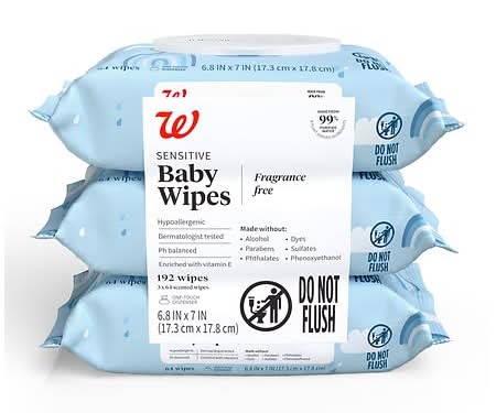 Gentle enough for use on baby's hands, face & bottom. Soft and durable Walgreens Baby Wipes are made from 99% purified water and plant derived ingredients. Dermatologist-recommended, pH balanced, and hypoallergenic, these wipes clean and moisturize sensitive skin. Directions. fragrances free. Open lid and remove inner label. Take out wipe one at a time. Use wipe. When finished, dispose of used wipe in trash. Do not flush. Close lid on pack to retain moisture. Each Contain 64 wipes .Total 192 wipes. Size: 6.8x7 in