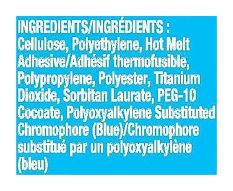 Ingredients: Cellulose, Polyethylene, Hot Melt Adhesive, Polypropylene, Polyester, Titanium Dioxide, Sorbitan Laurate, PEG-10 Cocoate, Polyoxyalkylene Substituted Chromophore (Blue)