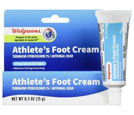 Walgreens Athlete's Foot Antifungal Cream provides full prescription strength treatment for athlete's foot. Formulated to cure most cases, it offers relief from the discomfort of itching and burning sensations. Manufactured in Canada, this antifungal cream contains the same active ingredient as Lamisil AT, making it a recommended choice for effective treatment.