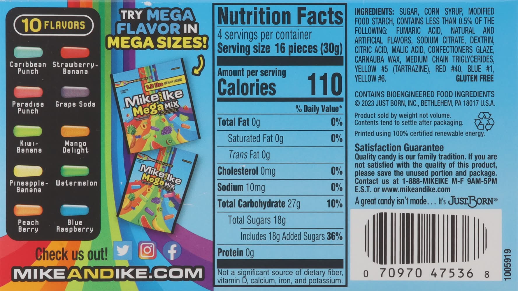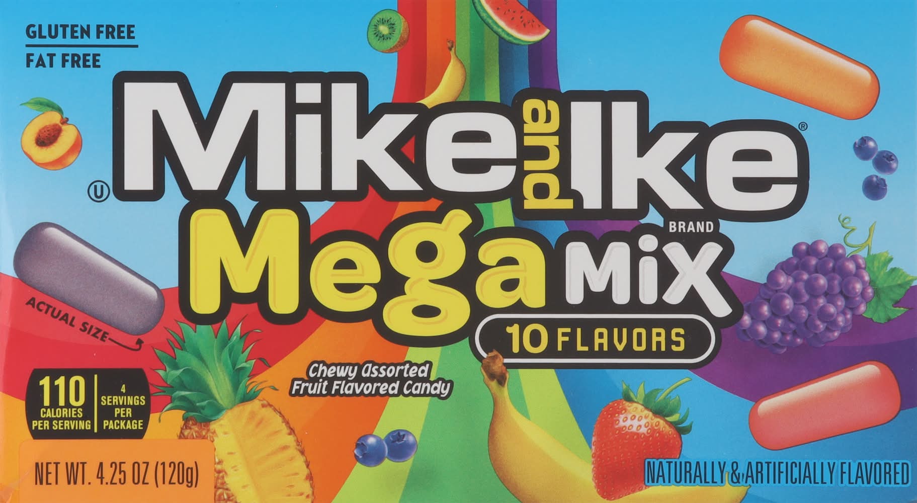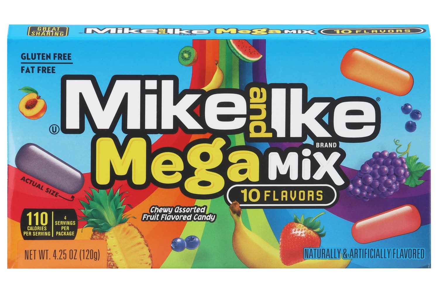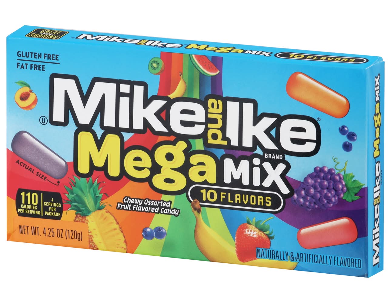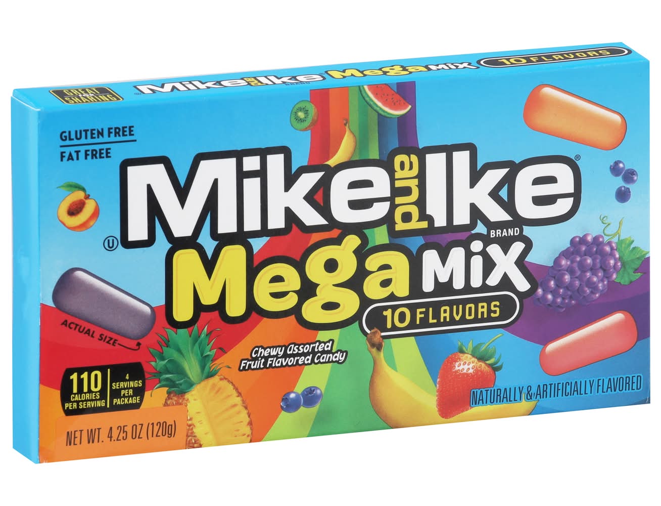 Turn up the flavor to TEN and get your taste buds ready for the insane fruity, chewy taste of MIKE AND IKE Mega Mix! MIKE AND IKE Mega Mix assorted candy is loaded with TEN INSANE fruity, chewy flavors including Caribbean Punch, Strawberry-Banana, Paradise Punch, Grape Soda, Kiwi-Banana, Mango Delight, Watermelon, Pineapple Banana, Peach Berry, and Blue Raspberry and all of these great tasting flavors come in a 4.25 ounce theater size box! Enjoy the great taste of Mega Mix one at a time, or mix • Flavor: Assorted • Packaging: Reusable