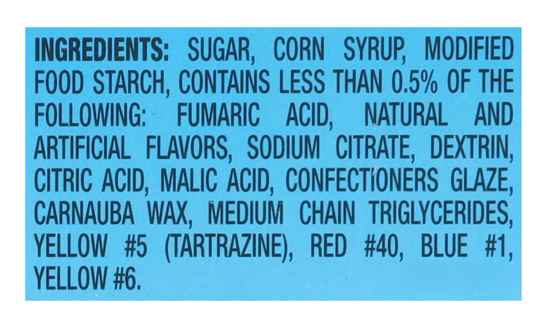 Ingredients: Sugar, Corn Syrup, Modified Food Starch, Contains Less than 0.5% of the Following: Fumaric Acid, Natural and Artificial Flavors, Sodium Citrate, Dextrin, Citric Acid, Malic Acid, Confectioners Glaze, Carnauba Wax, Medium Chain Triglycerides, Yellow #5 (Tartrazine), Red #40, Blue #1, Yellow #6 Contains: Corn (Maize) Additives: Artificial Flavors, Genetically Modified Ingredients