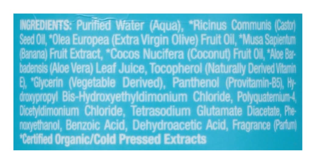 Ingredients: Purified Water (Aqua), Ricinus Communis (Castor) Seed Oil (Certified Organic/Cold Pressed Extracts), Olea Europea (Extra Virgin Olive) Fruit Oil (Certified Organic/Cold Pressed Extracts), Musa Sapientum (Banana) Fruit Extract (Certified Organic/Cold Pressed Extracts), Cocos Nucifera (Coconut) Fruit Oil (Certified Organic/Cold Pressed Extracts), Aloe Barbadensis (Aloe Vera) Leaf Juice (Certified Organic/Cold Pressed Extracts), Tocopherol (Naturally Derived Vitamin E), Glycerin (Vegetable Derived) (Certified Organic/Cold Pressed Extracts), Panthenol (Provitamin-B5), Hydroxypropyl Bis-Hydroxyethyldimonium Chloride, Behentrimonium Chloride, Polyquaternium-4, Dicetyldimonium Chloride, Tetrasodium Glutamate Diacetate, Phenoxyethanol, Benzoic Acid, Dehydroacetic Acid, Fragrance (Parfum)