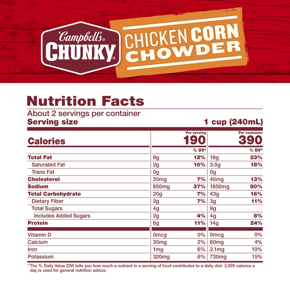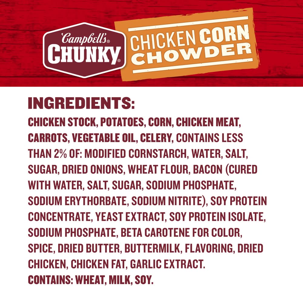 Campbell’s Chunky Chicken Corn Chowder Soup isn’t just tasty—it's made to work as hard as you do. With never-ending big flavors and bold ingredients, this comfort food classic is capable of fueling even the heartiest appetite. This ready-to-eat chicken soup is crafted with big pieces of chicken meat without antibiotics, corn, chunks of carrots, potatoes and savory seasoning. Each can has 14 grams of protein. It Fills You Up Right. Just pop this chicken soup in a microwave-safe bowl, heat and enjoy. Or, warm it over the campfire on your outdoor adventures. Whether you’re looking for quick and easy to microwave soups for home or something to take on the go, Campbell’s has you covered. Take on the great outdoors with Campbell’s Chunky Chicken Corn Chowder Soup—Soup That Eats Like a Meal. • Campbell Soup Company, Camden,NJ,USA • Packaging: Reusable
