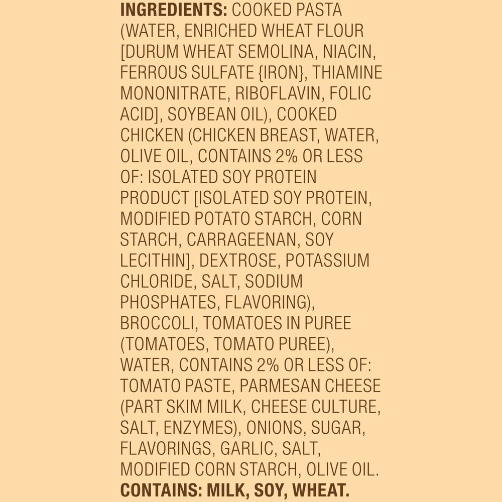 Ingredients: COOKED PASTA (WATER, ENRICHED WHEAT FLOUR [DURUM WHEAT SEMOLINA, NIACIN, FERROUS SULFATE {IRON}, THIAMINE MONONITRATE, RIBOFLAVIN, FOLIC ACID], SOYBEAN OIL), COOKED CHICKEN (CHICKEN BREAST, WATER, OLIVE OIL, CONTAINS 2% OR LESS OF: ISOLATED SOY PROTEIN PRODUCT [ISOLATED SOY PROTEIN, MODIFIED POTATO STARCH, CORN STARCH, CARRAGEENAN, SOY LECITHIN], DEXTROSE, POTASSIUM CHLORIDE, SALT, SODIUM PHOSPHATES, FLAVORING), BROCCOLI, TOMATOES IN PUREE (TOMATOES, TOMATO PUREE), WATER, CONTAINS 2% OR LESS OF: TOMATO PASTE, PARMESAN CHEESE (PART SKIM MILK, CHEESE CULTURE, SALT, ENZYMES), ONIONS, SUGAR, FLAVORINGS, GARLIC, SALT, MODIFIED CORN STARCH, OLIVE OIL, CITRIC ACID. CONTAINS: MILK, SOY, WHEAT. Contains: Milk, Soy, Wheat