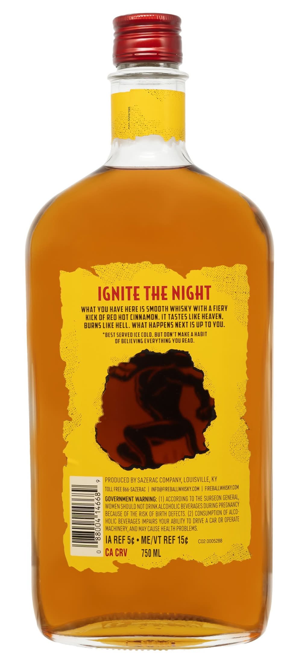 Free Your Fire with the heavenly taste and ferocious burn of Whisky. This is the perfectly blended Canadian whisky made with real cinnamon for a fiery kick of red hot cinnamon flavor. This is America’s 1 shot brand and 1 whiskey brand, making this cinnamon whisky the iconic choice for celebrating with friends at home or your favorite bar. A Fireball shot is the perfect whiskey shot for pregaming before a chill night out. Fireball Canadian Whisky also tastes great when enjoyed straight or added to your favorite mixed drinks or a classic cocktail. The cinnamon flare of this hard liquor also enhances your favorite hard seltzer, hard cider and other alcoholic drinks. With countless ways to enjoy this Cinnamon Whisky, bending the rules is easy - and delicious. Store it at room temperature or store and pour straight from your freezer to enjoy an icy, spicy shot. It is one of a kind, not to be replaced by any other copycat cinnamon whiskey. It tastes like heaven and burns like hell. • Flavor: Cinnamon • Alcohol by volume: 33% • Packaging: Reusable
