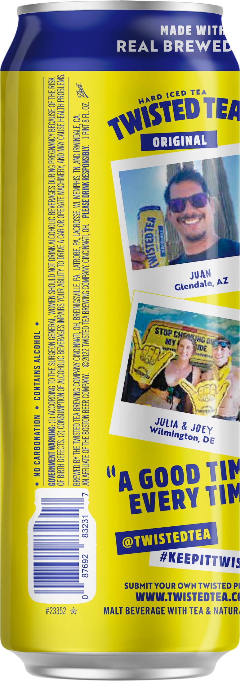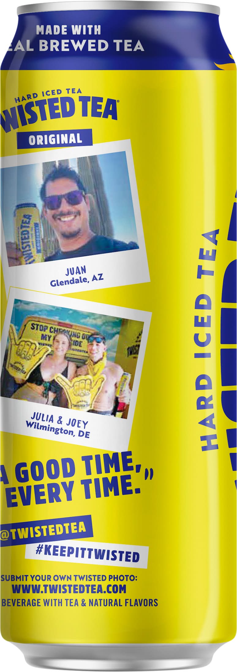 Malt beverage with select teas & natural flavors. Flavored beer. Hard Iced tea with a twist of lemon. Made with real brewed tea. Be a little twisted. No carbonation. 5% alc./vol. Please drink responsibly. twistedtea.com. @TwistedTea. #BeALittleTwisted. Submit your own twisted photo at: twistedtea.com. • Flavor: Original • Alcohol by volume: 5%
