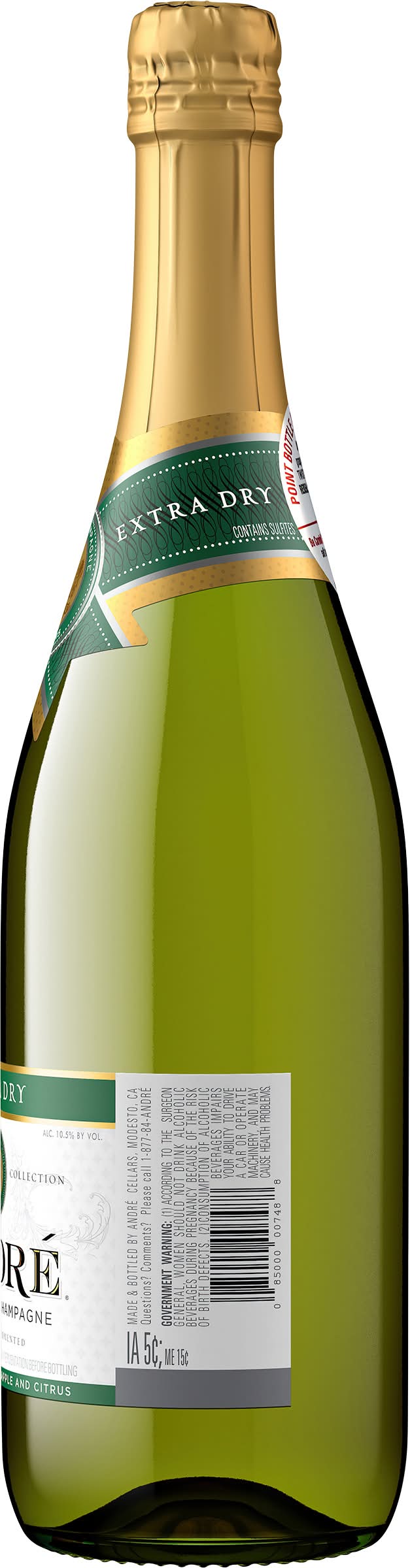 Andre Extra Dry Champagne is refreshing, fruity and slightly sweet. A perfect balance, along with the fresh pear and apple flavors make this sparkling wine a crowd favorite. Celebrate a bachelorette party or bridal shower with a well-chilled bottle of this crisp bubbly. This semi sweet wine also makes an excellent mix for mimosas and cocktails. Andre California champagne brings fun and festivity to every occasion. One 750 mL bottle of Andre Extra Dry Champagne Crisp, fruity and refreshing • Alcohol by volume: 10.5% • Andre Champagne Cellars, 600 Yosemite Blvd, Modesto, California, 95354