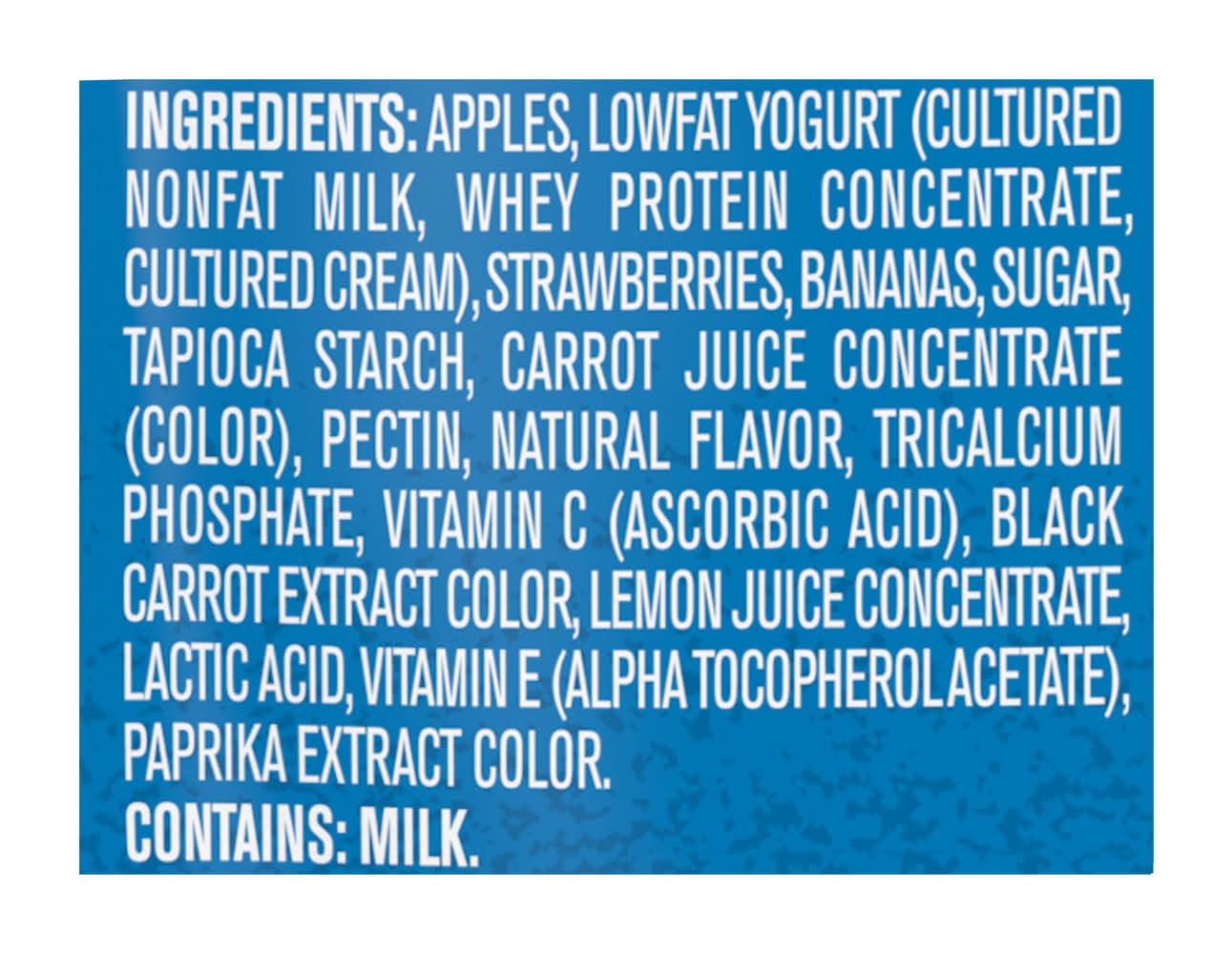 Ingredients: INGREDIENTS: APPLES, CULTURED LOWFAT MILK, STRAWBERRIES, BANANAS, SUGAR, TAPIOCA STARCH, NONFAT MILK, CARROT JUICE CONCENTRATE, PECTIN, NATURAL FLAVOR, GELATIN, VITAMIN C (ASCORBIC ACID), TRICALCIUM PHOSPHATE, BLACK CARROT EXTRACT COLOR, LACTIC ACID, VITAMIN E (ALPHA TOCOPHERYL ACETATE), PAPRIKA EXTRACT COLOR. *DOES NOT CONTAIN LIVE ACTIVE CULTURES Contains: CONTAINS: MILK