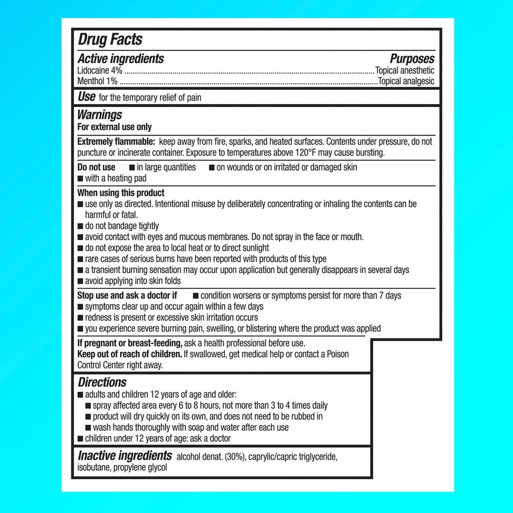Ingredients: Active Ingredients: Lidocaine 4 %, Topical Anesthetic.; Menthol 1 %, Topical Analgesic. Inactive Ingredients: Alcohol Denat. 30%, Caprylic/Capric Triglyceride, Isobutane, Propylene Glycol. Additives: Alcohol Denat. (30%), Caprylic/Capric Triglyceride, Isobutane, Propylene Glycol.