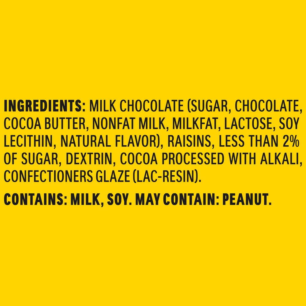 Ingredients: Milk Chocolate (Sugar, Chocolate, Cocoa Butter, Nonfat Milk, Milkfat, Lactose, Soy Lecithin, Natural Flavor), Raisins, Less than 2% of Sugar, Tapioca Dextrin, Cocoa Processed with Alkali, Confectioners Glaze (Lac-Resin). Contains: Milk, Soybeans, Lactose, Peanuts