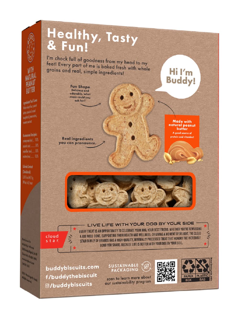 Buddy Biscuits are sure to put a smile on your dog's face. These crunchy biscuits are healthy, tasty, and fun - cooked into adorable gingerkid shapes! Not only that but they are minimally processed and made with only simple ingredients that you pronounce. Natural peanut butter is delicious, a good source of protein, and provides a mouthwatering flavor that your dog can't resist! Buddy Biscuits are a perfect treat for dogs everywhere. Made in United States