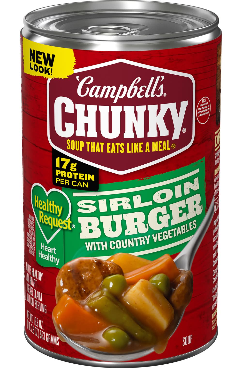 This heart-healthy soup features big pieces of seasoned beef sirloin burgers with potatoes, carrots, green beans and peas for a comforting taste that’s just like mom used to make. With 17g of protein per can, it’s a satisfying beef and vegetable soup that fuels even the heartiest of appetites. Campbell's Chunky Soup is a year-round pantry staple and the MVP of game day snacks, delivering a winning combination of flavor and convenience. Enjoy a warm bowl of this canned soup when watching the game from home, or use it as an ingredient in dips, casseroles and other tailgating recipes. Whether you’re a football fan or simply craving something hearty, Campbell's Chunky Healthy Request Sirloin Burger Soup will keep you feeling full and satisfied from kickoff to the final whistle. Make every game day a winner with Campbell's Chunky – Soup That Eats Like a Meal. • Campbell Soup Company, Camden, NJ • Packaging: Reusable