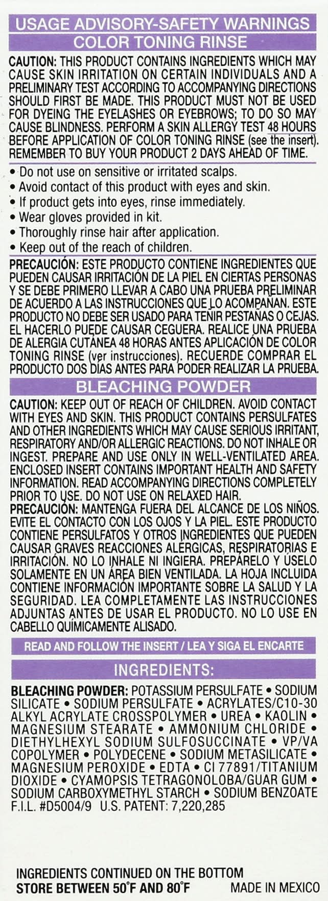 Ingredients: Bleaching Powder: Potassium Persulfate, Sodium Silicate, Sodium Persulfate, Acrylates/C10-30 Alkyl Acrylate Crosspolymer, Urea, Kaolin, Magnesium Stearate, Ammonium Chloride, Diethylhexyl Sodium Sulfosuccinate, VP/VA Copolymer, Polydecene, Sodium Metasilicate, Magnesium Peroxide, EDTA, CI 77891/Titanium Dioxide, Cyamopsis Tetragonoloba/Guar Gum, Sodium Carboxymethyl Starch, Sodium Benzoate. Frosting Protective Creme: Aqua/Water/Eau, Cetearyl Alcohol, Ammonium Hydroxide, Oleth-30, Hexadimethrine Chloride, Oleic Acid, Oleyl Alcohol, Pentasodium Pentetate, Ethanolamine, Parfum/Fragrance. Creme Developer: Aqua/Water/Eau, Hydrogen Peroxide, Cetearyl Alcohol, Sodium Stannate, Trideceth-2 Carboxamide MEA, Pentasodium Pentetate, Phosphoric Acid, Ceteareth-25, Tetrasodium Pyrophosphate, Glycerin. Color Toning Rinse: Aqua/Water/Eau, CI 60730/Ext. Violet 2, CI 61570/Green 5, PEG-2 Oleamine, Polyquaternium-11, Chlorhexidine Digluconate, Simethicone, Tartaric Acid, Parfum/Fragrance. After Frosting Conditioning Shampoo: Aqua/Water/Eau, Disodium Cocoampho-Dipropionate, Sodium Lauryl Sulfate, PPG-5-Ceteth-10 Phosphate, Phosphoric Acid, PPG-12-PEG-50 Lanolin, Glycol Distearate, Polyquaternium-10, Hexylene Glycol, Sodium Benzoate, Parfum/Fragrance, Tartaric Acid, PEG-55 Propylene Glycol Oleate, Salicylic Acid, Propylene Glycol