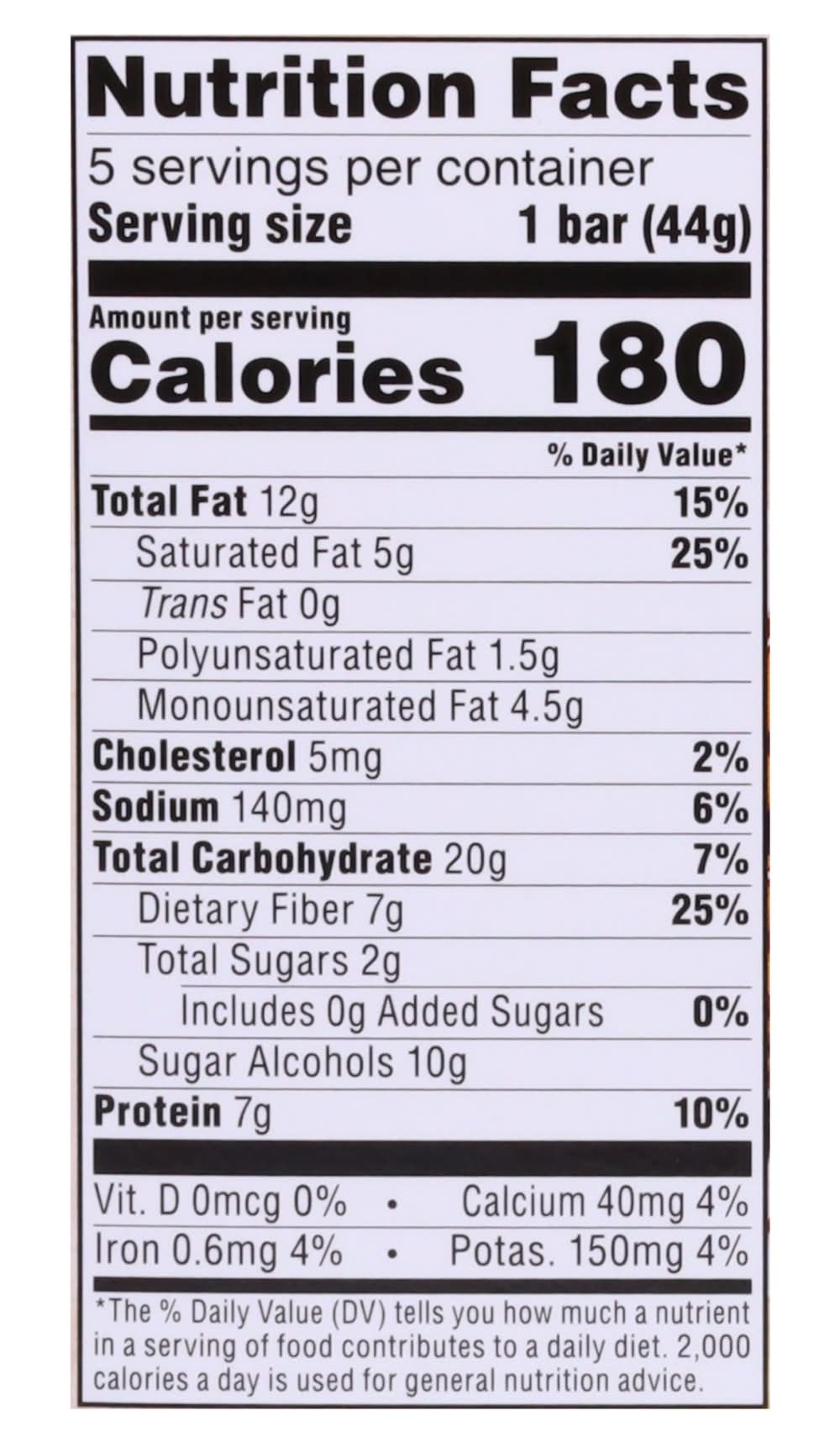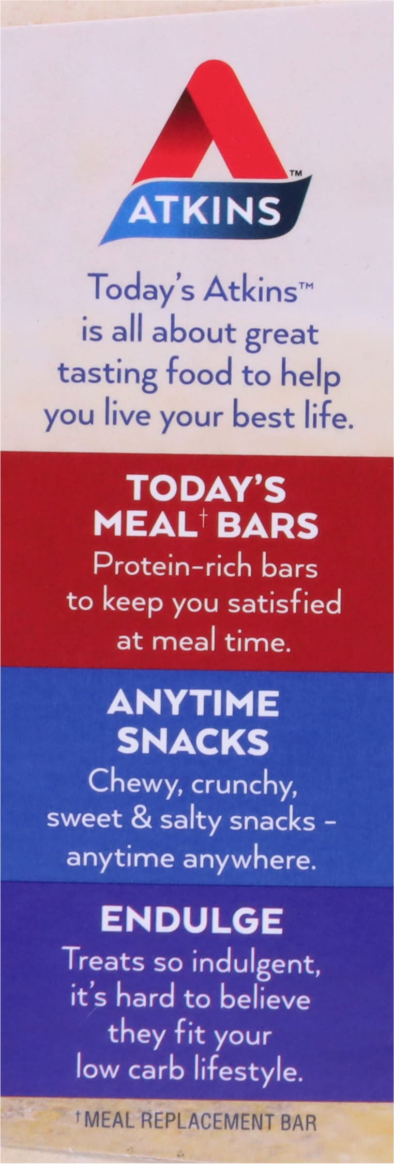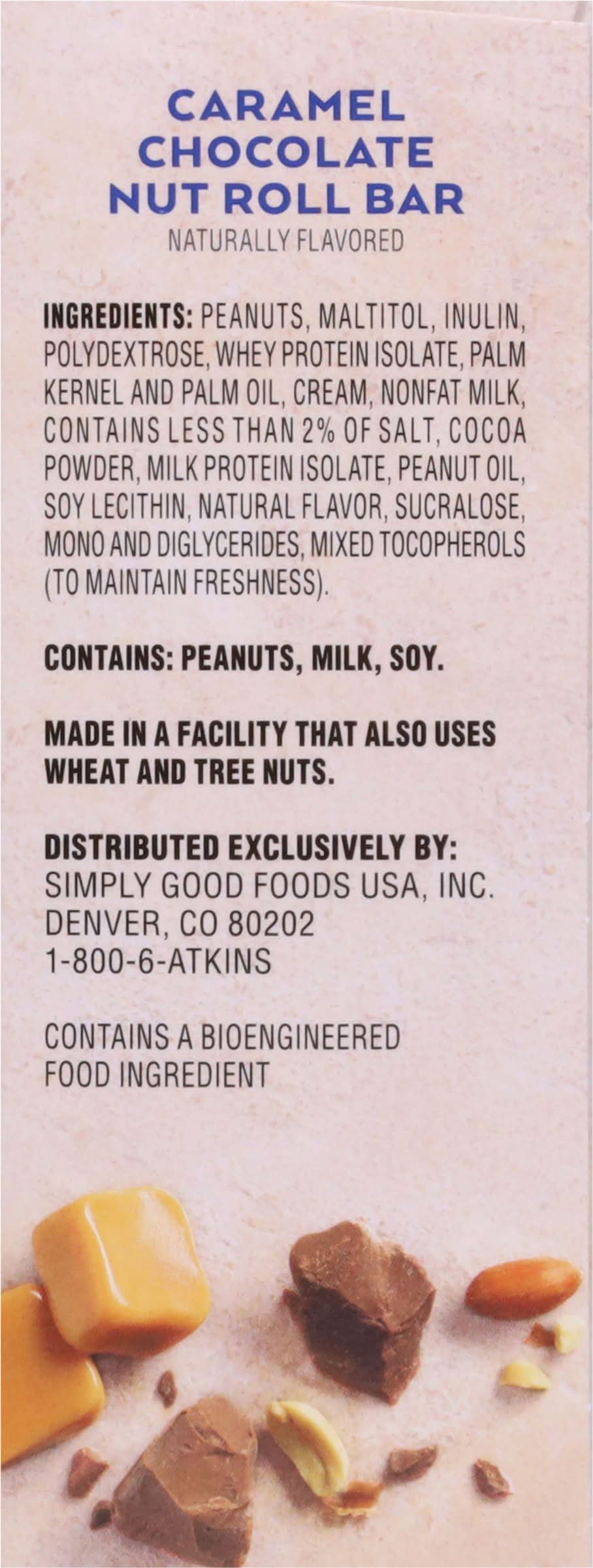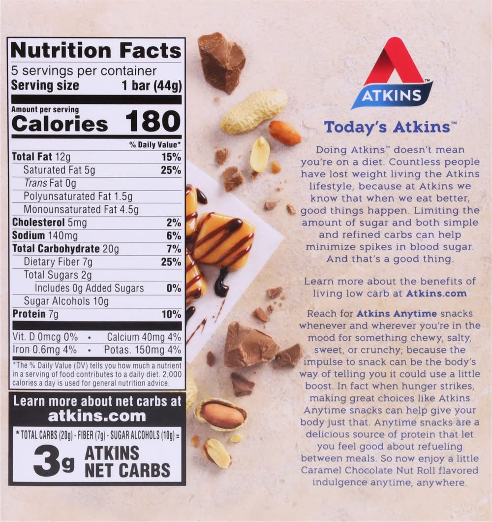 Naturally flavored. 7 g protein. 3 g net carbs (total carbs [20 g] - fiber [7 g] - sugar alcohol [10 g] = 3 g Atkins net carbs). 2 g sugar. 12 g of total fat. Rich in fiber. See nutrition information for fat sat content. Contains a bioengineered food ingredient. What is the hidden sugar effect? It's common knowledge that consuming foods with large amounts of sugar may cause your blood sugar to spike, but, did you know other types of carbohydrates may have the same effect on blood sugar? We call this the hidden sugar effect. It's why a medium size bagel has the same impact on blood sugar as eating 8 teaspoons of sugar! (Based on glycemic load). And that's just one example - many foods loaded with simple or refined carbs can have a similar impact on blood sugar. But at Atkins, we've designed all of our delicious bars, shakes, and treats to limit simple and refined carbohydrates to help minimize the hidden sugar effect. No maltitol. Atkins has all your weight loss needs covered with products for every occasion! Meal (Meal Replacement Bar): Good source of protein and fiber to keep you satisfied. Snack The perfect amount of protein and fiber for a between meal snack. Treat: Indulgent dessert for a perfect after meal treat. Find out more at atkins.com. Paperboard packaging. Recyclable. • Flavor: Caramel chocolate • Pack size: 5 • Atkins Nutritionals, Denver, CO, 80202 • Packaging: Reusable