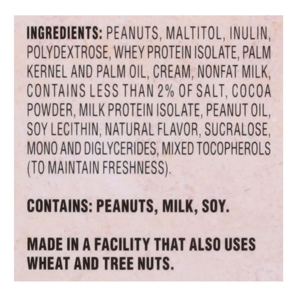 Ingredients: Peanuts, Maltitol, Inulin, Polydextrose, Whey Protein Isolate, Palm Kernel and Palm Oil, Cream, Nonfat Milk, Contains Less than 2% of Salt, Cocoa Powder, Milk Protein Isolate, Peanut Oil, Soy Lecithin, Natural Flavor, Sucralose, Mono and Diglycerides, Mixed Tocopherols (to Maintain Freshness) Contains: Peanuts, Milk, Soybeans, Wheat, Tree Nuts